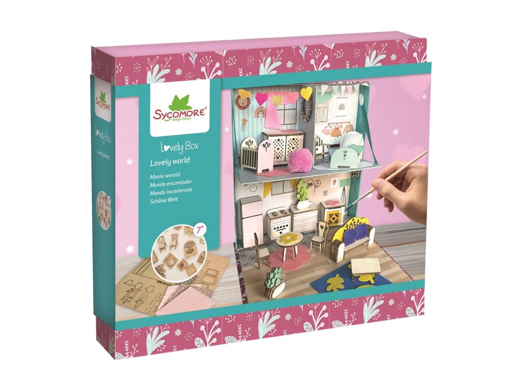 Vytvorte si svoj vlastný útulný domáci interiér v celopotlačenej škatuli, ktorú možno používať pre skladovanie. Drevený nábytok si deti zostavia, nafarbia a dozdobia doplnkami a samolepkami.