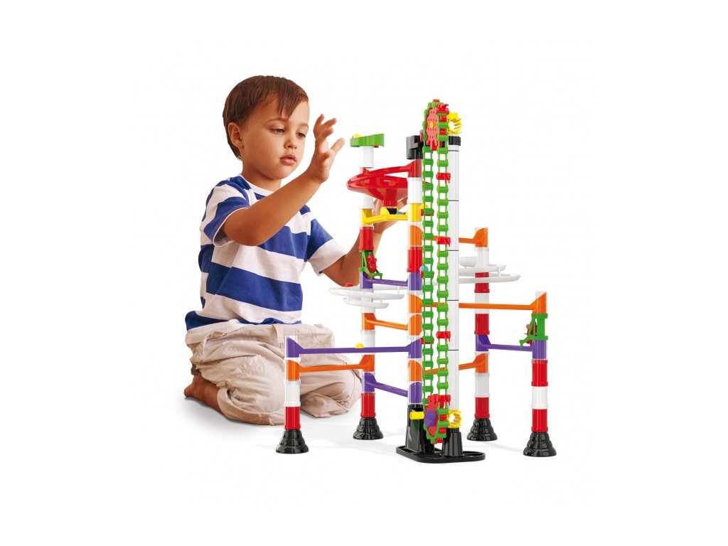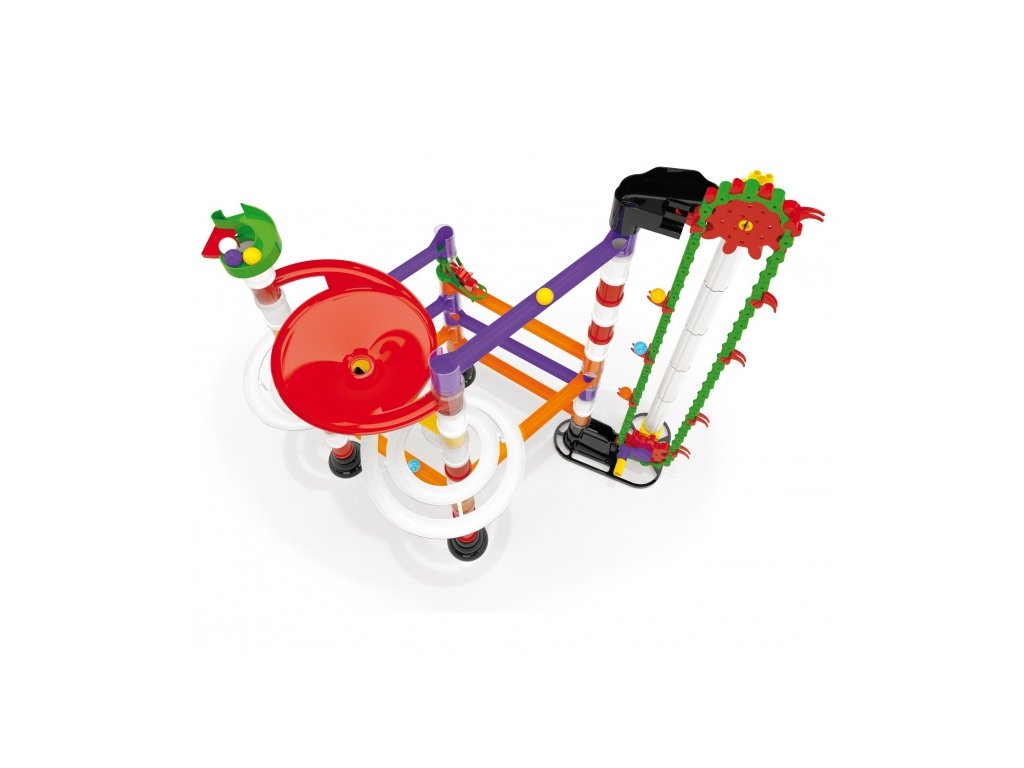 Vytvorte si vďaka tejto úžasnej stavebnici svoju vlastnú guľôčkovú dráhu. Postavte si modely vyobrazené na škatuli alebo si užite experimenty s vlastnými návrhmi. Všetky vzájomne do seba zapadajúce šmýkačky, mostíky, stĺpiky, lopatkové kolesá, špirály a lieviky vám ponúkajú nekonečnú škálu kombinácií a zaručujú zábavu na dlhú dobu. Hračka rozvíja tvorivosť a logické myslenie, ktoré sú k stavbe krásnych, ale hlavne funkčných dráh so správnym sklonom úplne nevyhnutné. Vďaka úžasnému výťahu môžete teraz vytvárať nekonečné množstvo guľôčkových kaskád s očarujúcim vizuálnym efektom. Určené pre deti od 5 rokov.Dodatočné parametre