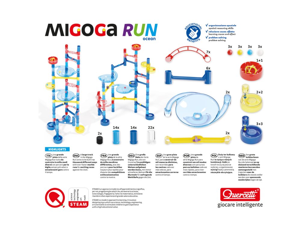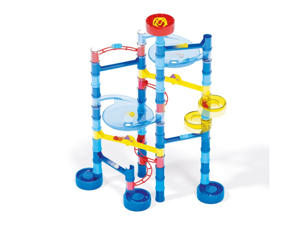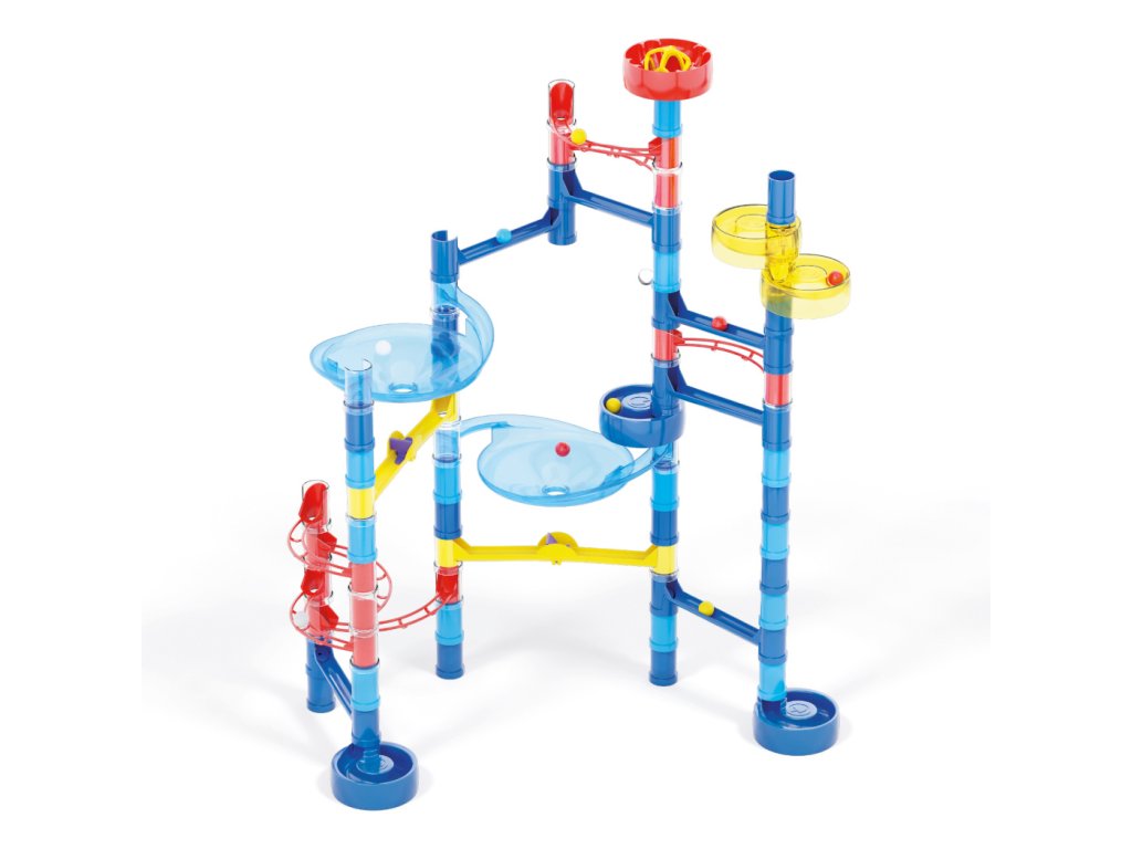 Guľôčková dráha Quercetti ponúka nekonečné možnosti stavania – deti si podľa návodu alebo vlastnej fantázie vytvoria funkčné trate s tunelmi, špirálami aj šmykľavkami. Farebné guľôčky štartujú súčasne, ale vďaka rozdielnym trasám sa vydávajú na dobrodružnú cestu naprieč oceánom – víria hlbokou vodou, míňajú tropické ostrovy a strácajú sa v morských prúdoch. Hra rozvíja tvorivosť, priestorovú predstavivosť a logické myslenie, zároveň hravo približuje princípy gravitácie a mechaniky. Diely sa ľahko spájajú, pevne držia a ponúkajú nekonečné kombinácie pre nové a nové stavby. Pre deti od 5 rokov.