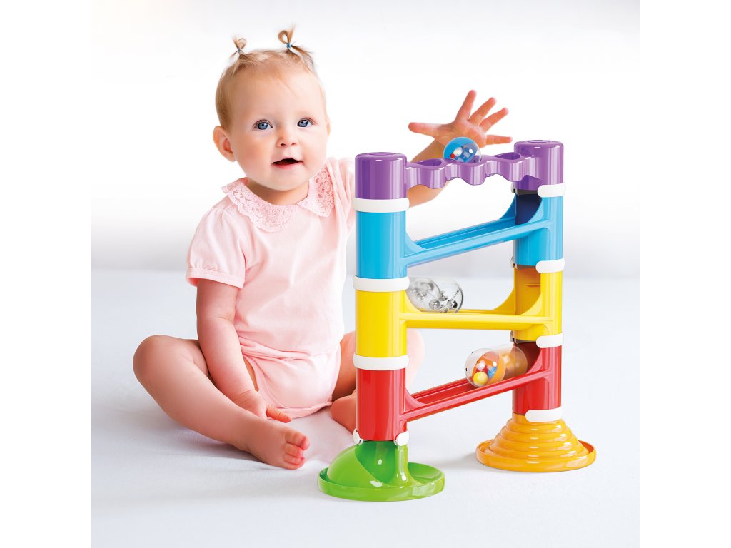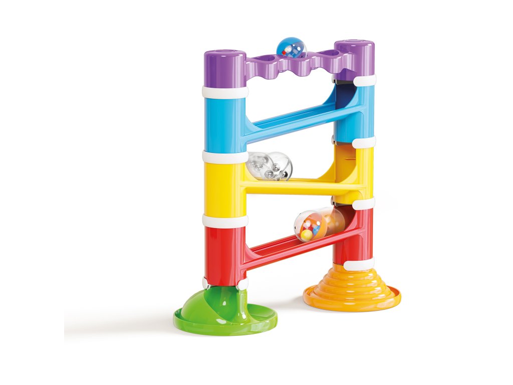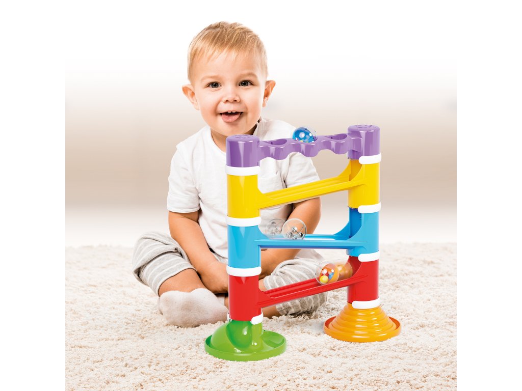 Jednoduchá guľôčková dráha pre malých objaviteľov od 18 mesiacov je navrhnutá s ohľadom na ich potreby a schopnosti. Súčasťou dráhy sú 3 veľké zvukové guľôčky. Najprv je potrebné pretlačiť guľôčku vrchným poschodím, potom sa začne gúľať po dráhe dole a vydáva pre deti fascinujúce zvuky. Pretlačenie guľôčok, ich sledovanie, ako rýchlo frčia po dráhe, nielenže podnecuje detskú zvedavosť, ale tiež podporuje rozvoj motorických zručností a učí deti chápať príčinu a následok. Deti sa budú baviť nielen pri hre, ale tiež pri objavovaní rôznych zvukov, ktoré každá z guľôčok vydáva, čo obohacuje ich zmyslové vnímanie.Dodatočné parametre