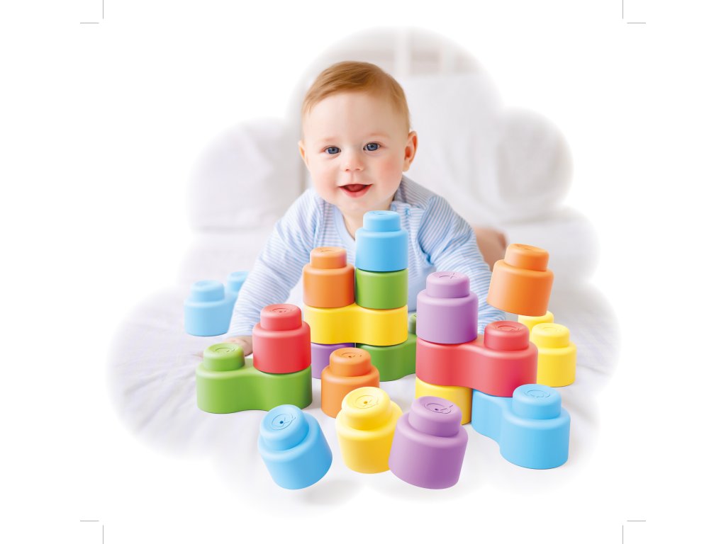 Stavebnica pre najmenšie deti od 6 mesiacov. Na deti čaká 32 farebných mäkkých kociek so zaoblenými tvarmi. Kocky sa jednoducho stohujú jedna na druhú a deťom ponúkajú nekonečné kombinácie a zaručenú zábavu. Mäkký materiál je príjemný na dotyk a dobre sa s ním manipuluje. Stavebnica rozvíja u detí manuálnu zručnosť, jemnú motoriku a koordináciu ruka-oko. Rozmery balenia sú 22 x 13 x 25,5 cm.Dodatočné parametre