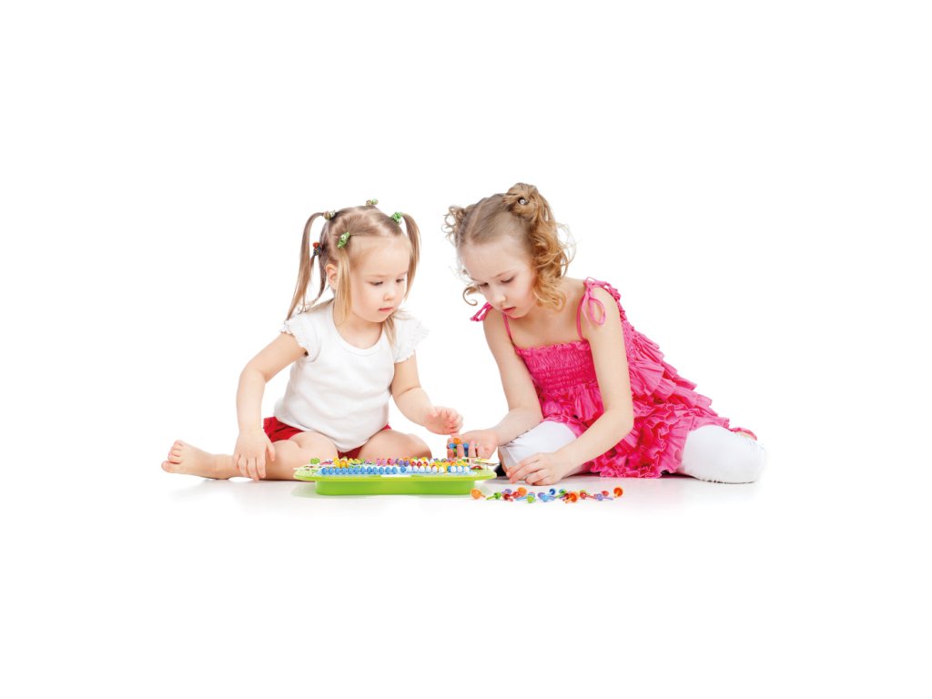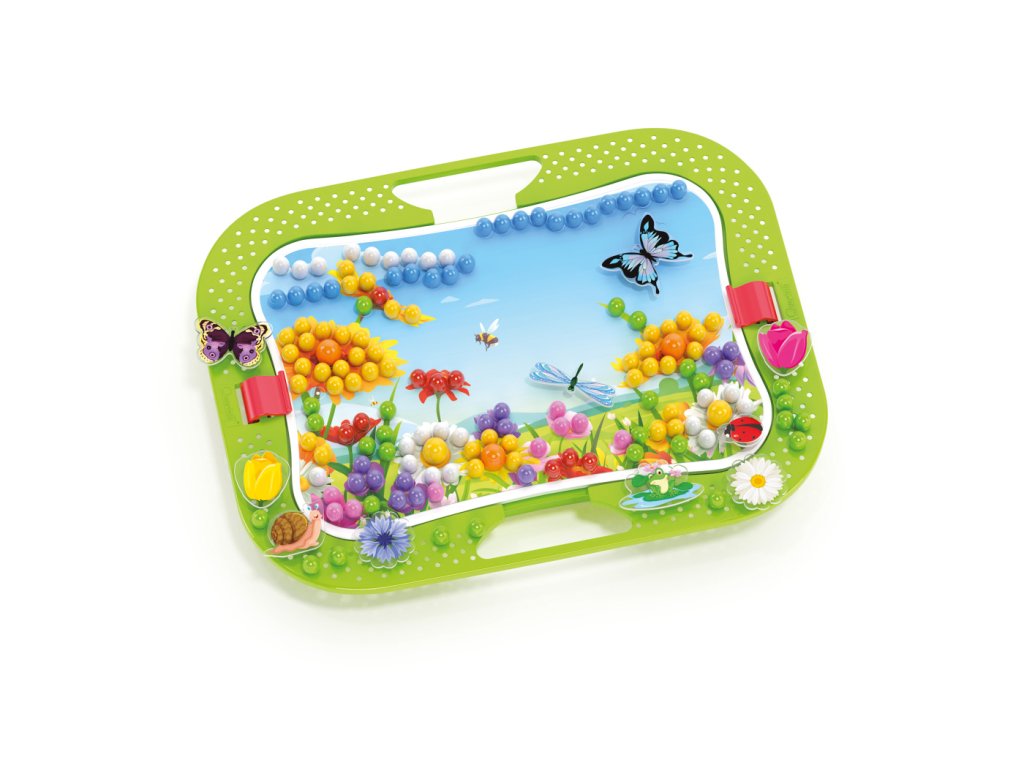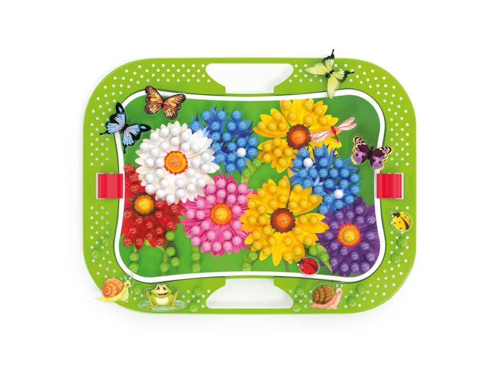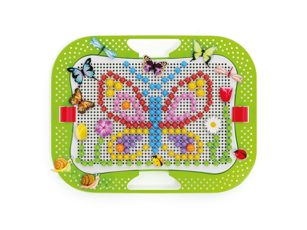 Kreatívna mozaiková hra určená deťom od 3 rokov. Perforovaná plastová doska je vsadená v ráme s oblými hranami. Deti vkladajú plastové farebné hríbiky do otvorov v doske a vytvárajú obrázky s kvetinami, motýľmi, vážkami a lienkami podľa šablóny z priloženého albumu, alebo si mozaiku tvoria podľa vlastnej fantázie. Vďaka zabudovaným rukovätiam je hra ideálna aj na prenášanie. Po skončení hry možno všetko uložiť do kufríka, ktorého veko po zaistení poistkou tvorí sama hracia doska. Tvorba mozaiky je zábavná, kreatívna činnosť, ktorá podporuje vnímanie farieb a zároveň rozvíja manuálne zručnosti, jemnú motoriku a koordináciu ruky a oka.