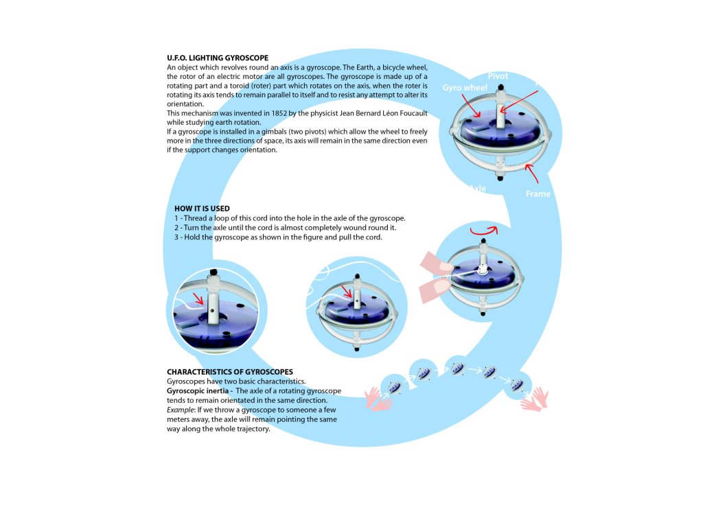 Gyroskop sa udrží v rovnováhe v rôznych polohách vďaka rotačnému pohybu. Slúži ako zábavná hračka i učebná pomôcka pre deti od 6 rokov na demonštráciu fyzikálnych princípov. Gyroskop je vybavený LED svetelným rotorom. Ovládanie pomocou kábla, ktorý je súčasťou balenia. Červená škatuľka – Gyroskop svieti na červeno Modrá škatuľka – Gyroskop svieti na modro Obsah balenia: gyroskop, kábel • Priemer rotora: 68,6 mm • Svietiaci rotor s 5 LED diódami Batéria: Typ LR44 Prístroj sa predáva v dvoch farebných variantoch – s modrým a s červeným svetlom. Pokiaľ máte záujem o konkrétnu farbu, napíšte nám, prosím, svoju voľbu do poznámky k objednávke.Dodatočné parametre