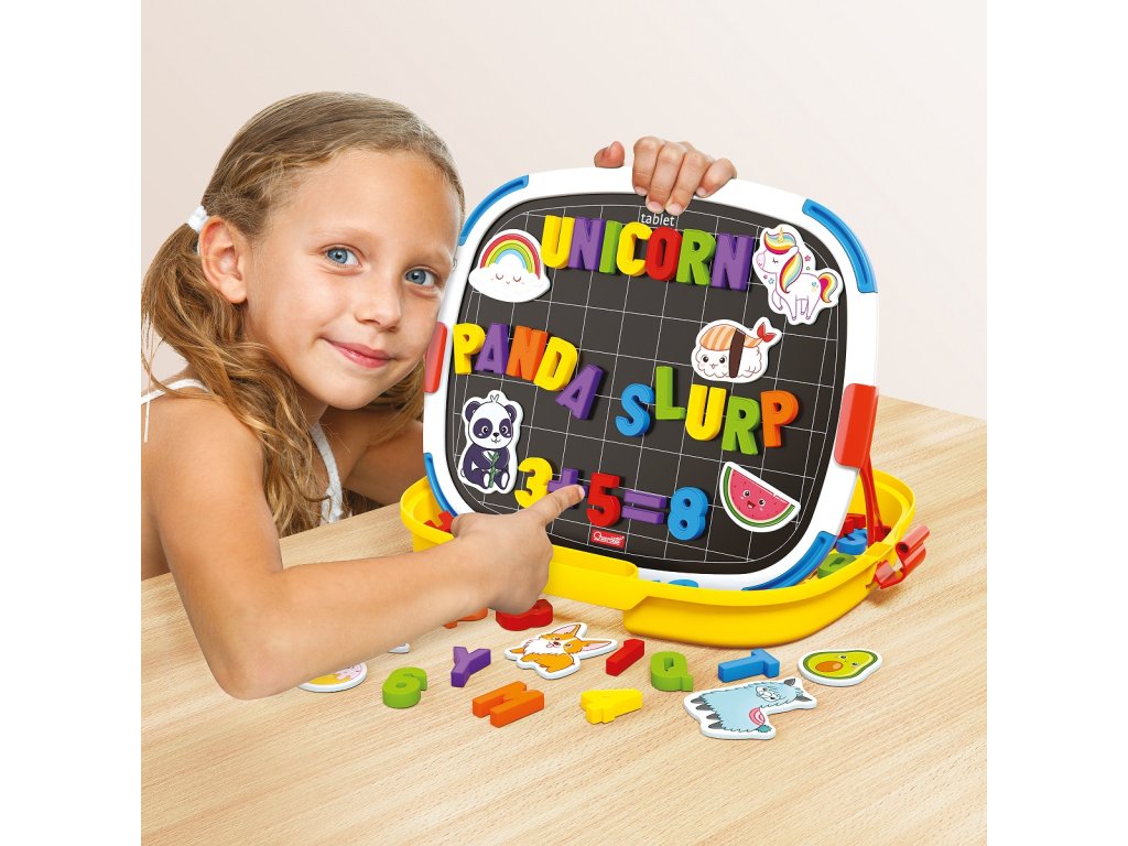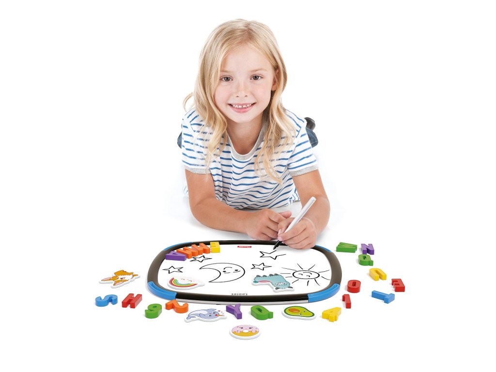Obojstranná magnetická tabuľa je navrhnutá pre prvé zoznamovanie s abecedou a s číslami, skladanie slov, počítanie aj kreslenie. Bezpečná, odolná doska s gumovými ochrannými hranami a oblými rohmi je ideálna pre deti od 5 rokov.
