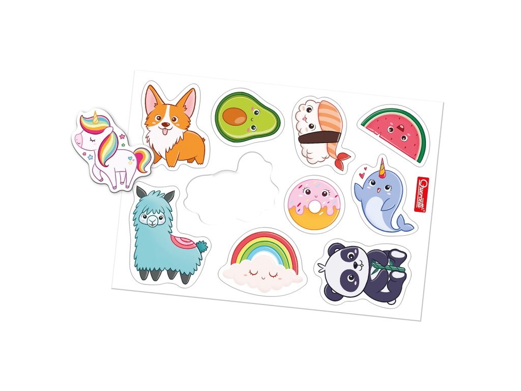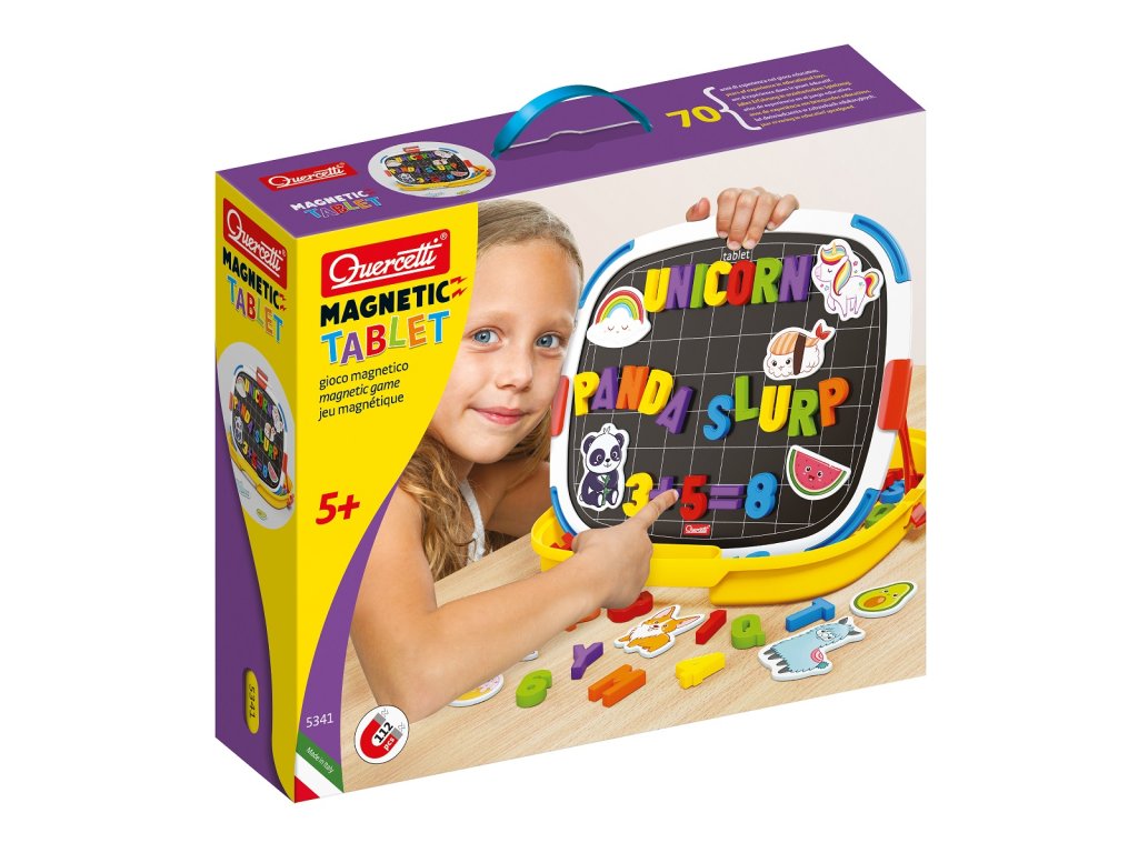 Obsah balenia: obojstranná magnetická tabuľa (biela pre písanie fixkou, čierna magnetická) • 48 magnetických písmen • 48 magnetických čísel • 10 obrázkových magnetov • 1 stierateľná fixka + 1 hubka • 2 stojany (vertikálne alebo horizontálne použitie) • úložný box