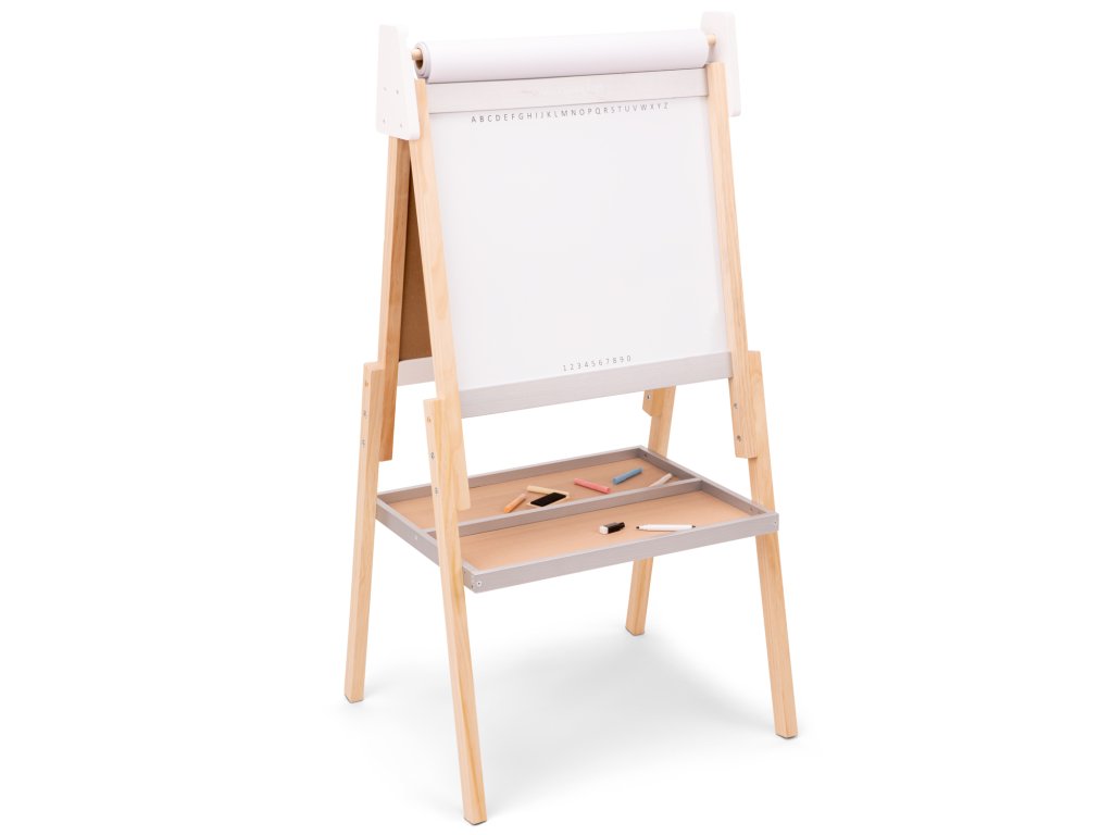 Výškovo nastaviteľná tabuľa poskytne malým umelcom priestor pre maľovanie, kreslenie a písanie, a to vďaka kombinácii klasickej tabule na kriedy, magnetickej plochy a papierovej rolky. Tabuľa porastie zároveň s dieťaťom, najnižšia výška je 110 cm a najvyššia výška je 114,5 cm. Súčasťou balenia je päť kried, stierateľná fixka a guma, takže dieťa má na začiatok všetko, čo potrebuje pre okamžité tvorenie. Tabuľa nielen, že poskytne deťom hodiny zábavy, ale zároveň podporuje rozvoj motoriky, kreativity a predstavivosti. Skvelý doplnok každej herne, ktorý vaše dieťa povedie k objavovaniu sveta umenia. 1. Multifunkčné vyhotovenie – tabuľa, magnetická plocha a papierová rolka v jednom. 2. Podporuje kreativitu, motorické zručnosti a umelecký rozvoj dieťaťa. 3. Výškovo nastaviteľný dizajn rastie s vaším dieťaťom, čo zaisťuje dlhodobé využitie. Vyrobené zo 100 % certifikovaného dreva FSC. Parametre: rozmery tabule sú 559 x 507 x 1140 mm.
