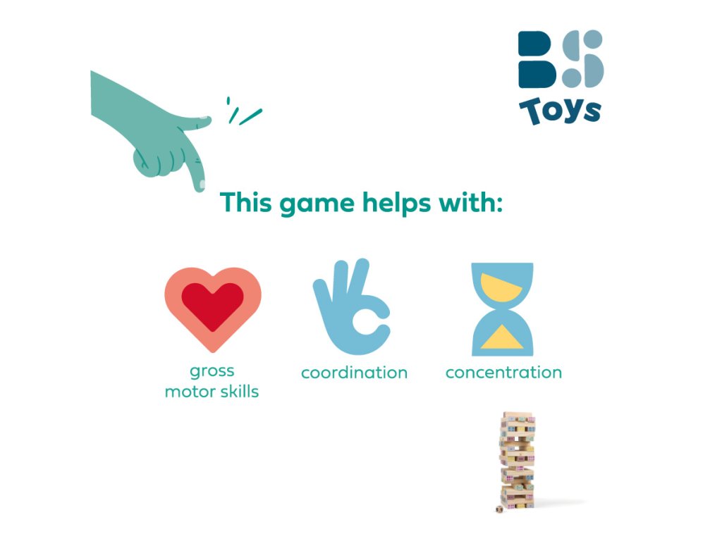 Zručnostná hra na spôsob Jengy pre 2 až 10 hráčov od 4 rokov kombinuje napätie s učením čísel. Hráči striedavo hádžu kockou a podľa výsledku odstraňujú drevené bloky, ktoré sa zhodujú s číslom. Môžu vybrať jeden blok, alebo dva bloky, ktorých súčet zodpovedá číslu na kocke. Cieľom je odstrániť drevené bloky z veže tak, aby nespadla. Hráč, ktorému veža spadne, prehráva.