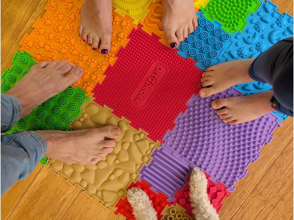 Senzorické podložky ORTOPEDEK pomáhajú pri: korekcii plochej nohy – rôzne výčnelky aktivujú svaly pozdĺžnej aj priečnej klenby a pomáhajú chodidlu vrátiť sa do prirodzeného tvaru, prevencii chybného držania tela – správna opora chodidla napomáha vyrovnaniu kolien, bedier aj chrbtice a znižuje riziko zlého postavenia kolien (valgózne postavenie) a hrbenia, tréningu rovnováhy – nestabilný povrch učí mozog rýchlejšie reagovať na zmeny, čo vedie k istejšiemu a vedomejšiemu pohybu, posilňovaní kolenných a členkových kĺbov – drobné, kontrolované náklony zapájajú stabilizačné svaly, čím sa znižuje riziko zranenia pri behu a skákaní, podpore senzorickej integrácie – rôzne farby a textúry stimulujú receptory príjemnými podnetmi, podporujú sústredenie a koordináciu celého tela.