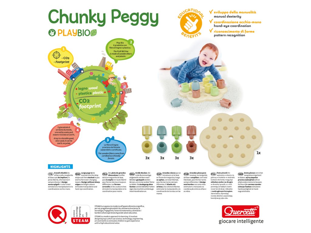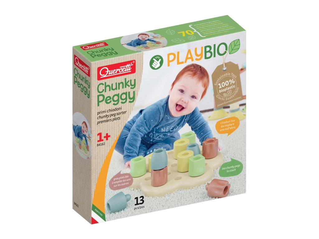 Chunky Peggy je bezpečná, farebná stavebnica s veľkými hríbikmi a podložkou v tvare kvetiny. Dieťa môže hríbiky zapichovať do otvorov alebo stavať veže. Hračka je vyrobená v Taliansku z biokompozitného materiálu z dreva a plastu, ktorý je navrhnutý tak, aby znižoval emisie CO2 na planéte. Hra podporuje rozvoj jemnej motoriky, učí farby a tvary a napomáha koordinácii ruky a oka. Veľké, farebné hríbiky sú ľahko uchopiteľné pre malé detské ručičky. Dizajn je bezpečný pre malé deti – jemné zaoblené tvary, žiadne ostré hrany.