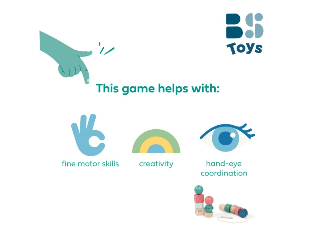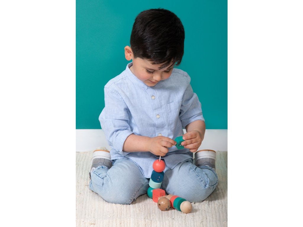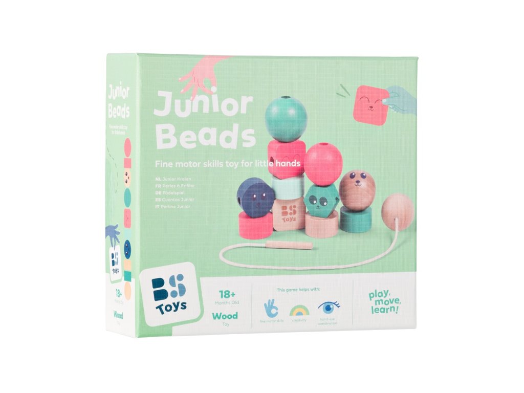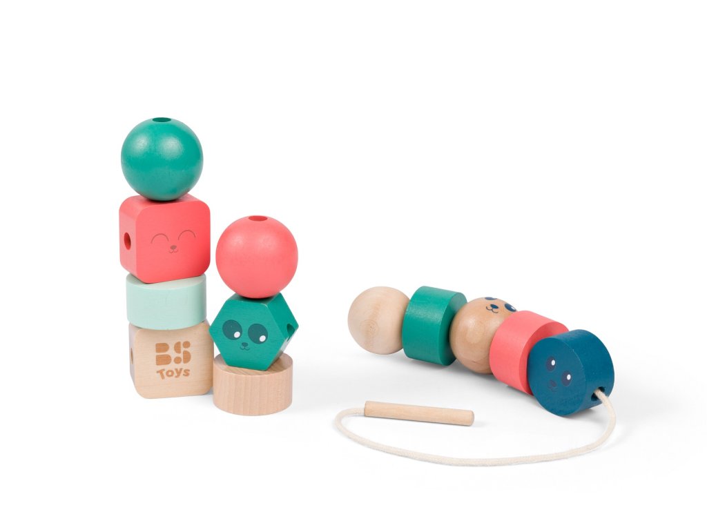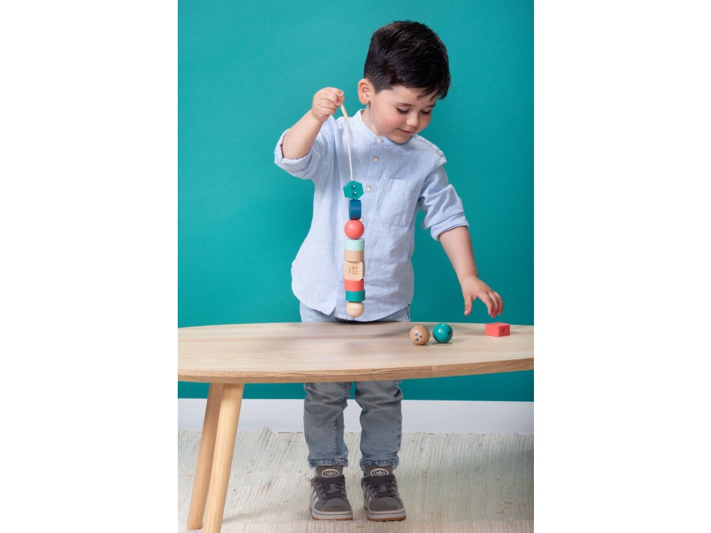 Súprava rôznofarebných drevených korálikov pre deti od 18 mesiacov. Prevliekanie farebných korálikov je skvelý spôsob, ako precvičiť koordináciu ruka-oko a jemnú motoriku. Koráliky a kocky sú extra veľké a ľahko sa s nimi malým deťom manipuluje.