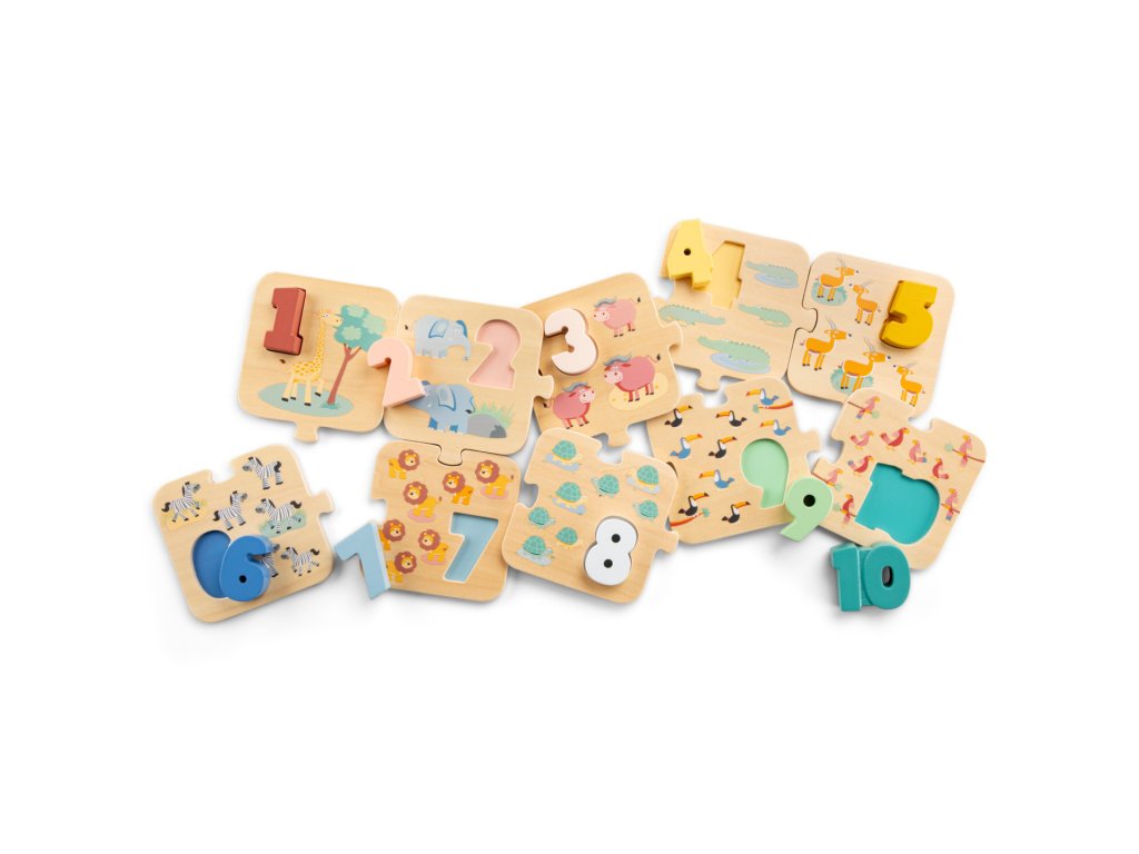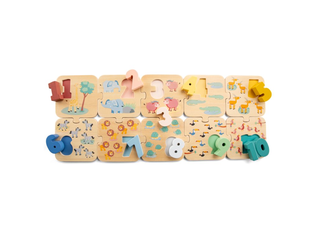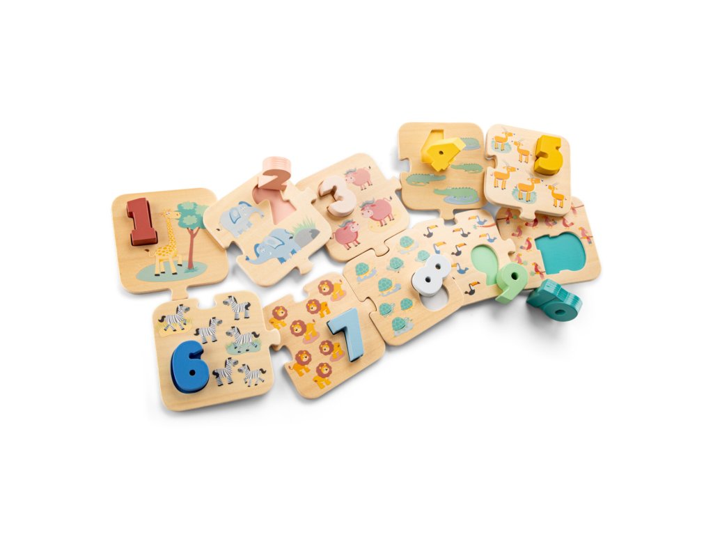 Spočítajte zvieratká a zložte dieliky skladačky v správnom poradí od čísla 1 do čísla 10 v dvoch radoch. Nakoniec pridajte ku každému dieliku skladačky správne drevené číslo podľa počtu zvieratiek. Táto skladačka je ideálna vzdelávacia hračka pre deti od 2 rokov. Deti sa naučia základné číslice a počítať do 10. Navyše tieto puzzle napomáhajú rozvoju jemnej motoriky. Balenie obsahuje 10 drevených dielikov skladačky a 10 drevených číslic. Rozmery hračky sú 50 x 20 x 2 cm.