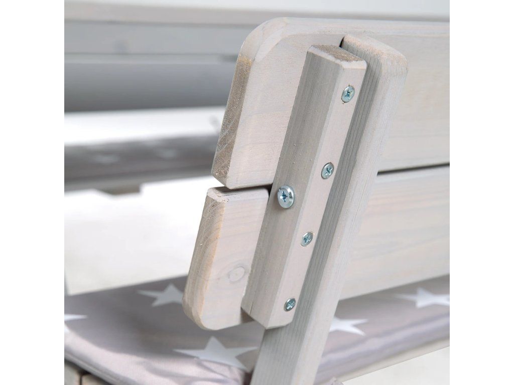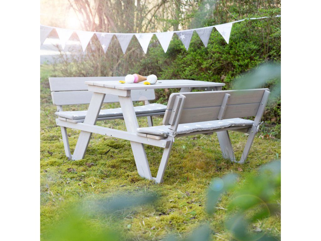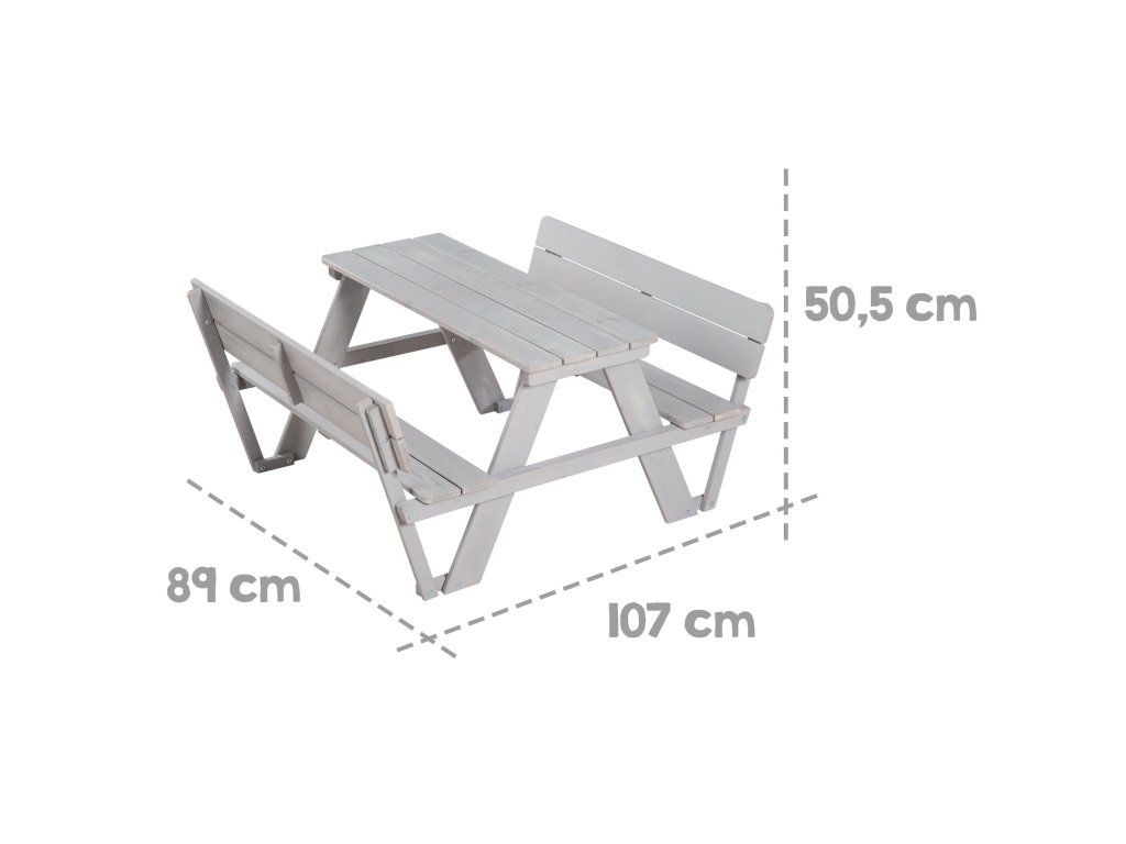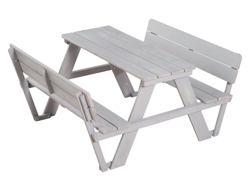 Detská vonkajšia sedacia súprava s operadlami je ideálna pre deti od 12 mesiacov a poskytuje miesto až pre 4 deti. Je vyrobená z kvalitného masívneho dreva, robustná, odolná voči poveternostným vplyvom a ošetrená sivou lazúrou. Sedaciu súpravu využijú deti na pikniky, maľovanie, tvorenie a hranie na záhrade alebo na terase. Premyslená konštrukcia zabraňuje prevráteniu a zaoblené rohy poskytujú bezpečné prostredie pre deti. Lavica a stôl sú pevne prepojené, čo zaisťuje stabilitu. Montáž je ľahká vďaka priloženému návodu. Povrch sedacej súpravy je umývateľný a ľahko sa udržuje. Sedacia súprava je vyrobená z dreva pochádzajúceho zo zodpovedne obhospodarovaných zdrojov. Všetky použité materiály sú testované na škodlivé látky.