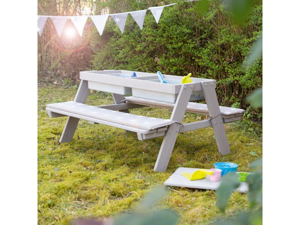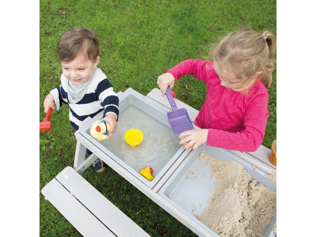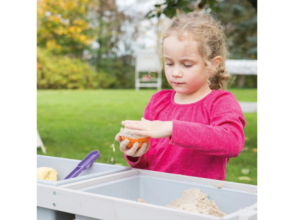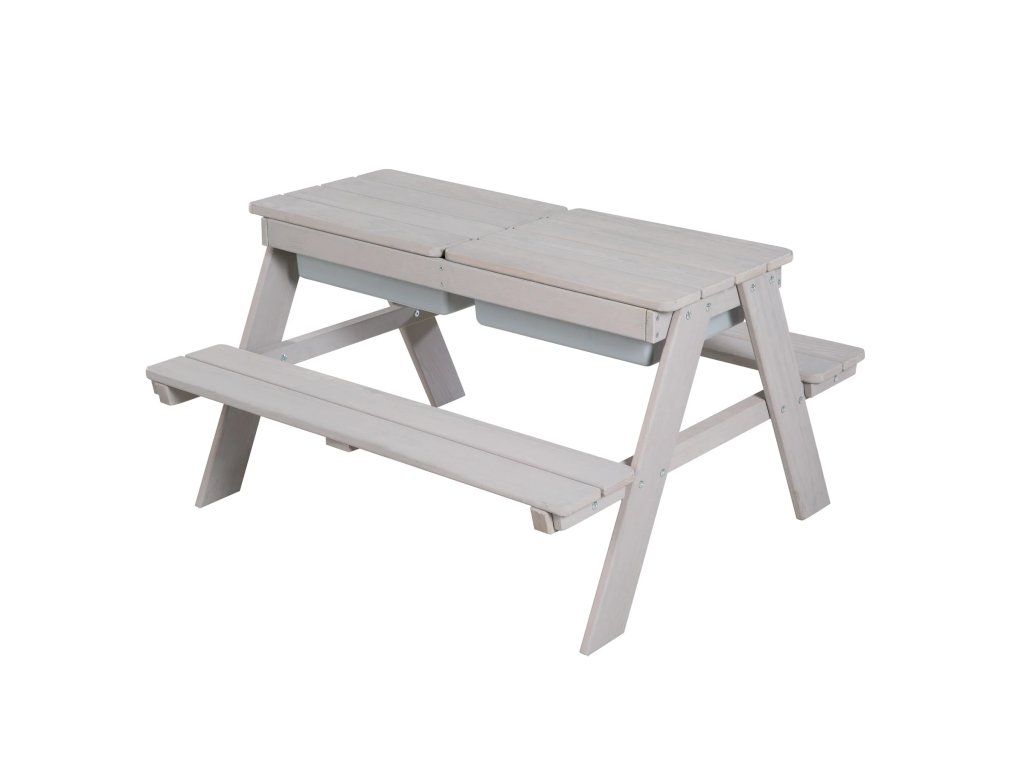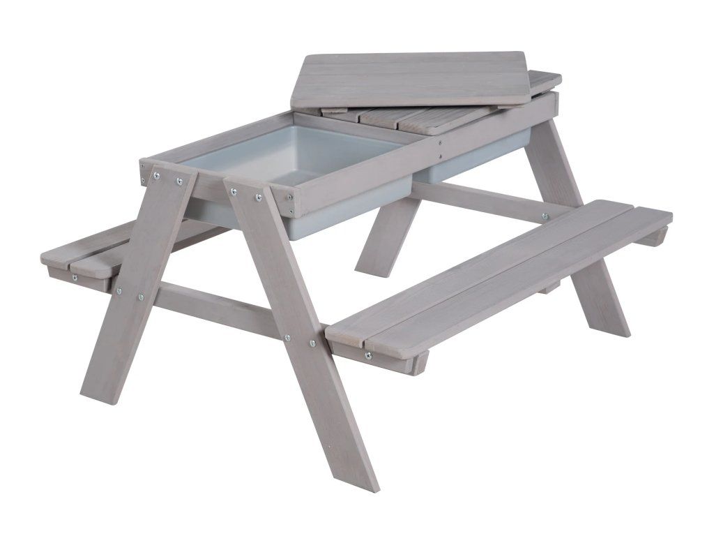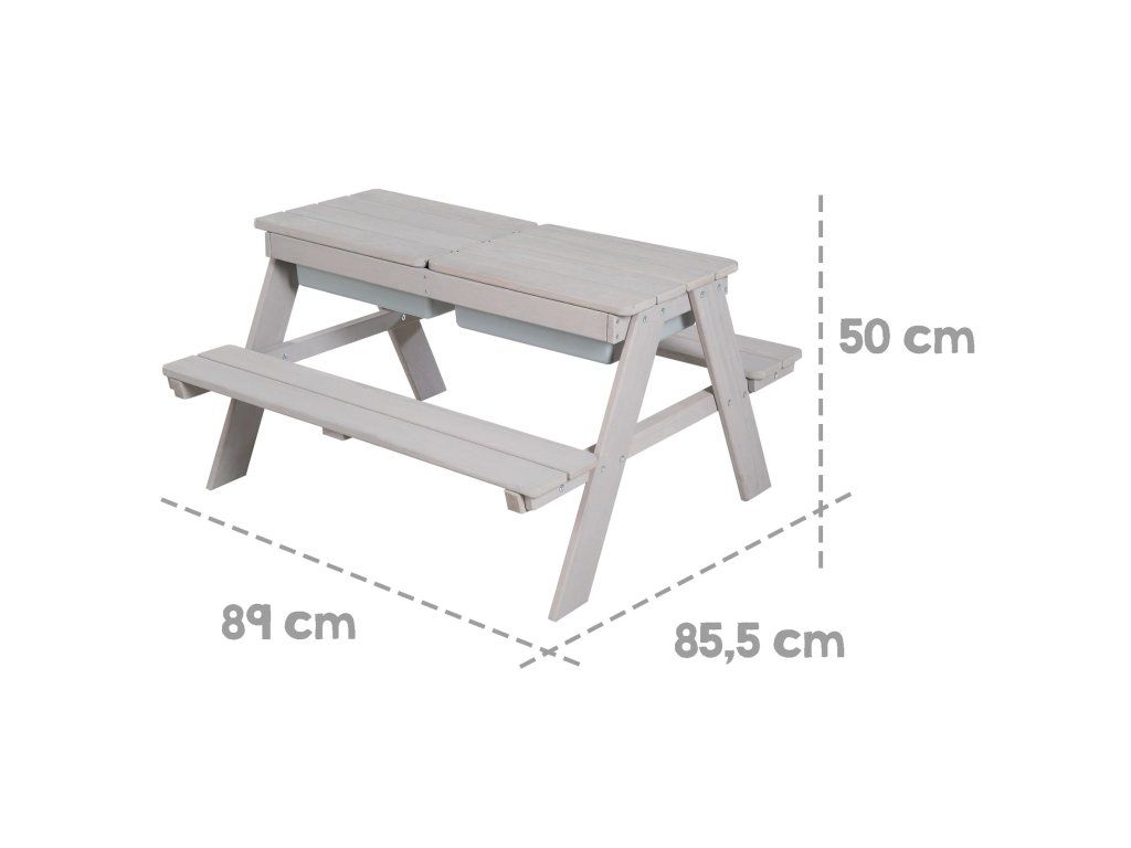 Táto detská sedacia súprava má stôl s hracími vaničkami. Je vyrobená z kvalitného, poveternostným vplyvom odolného masívneho dreva, preto je ideálna na záhradu alebo na terasu. Súprava je vhodná pre deti od 1 do 8 rokov. Zaoblené rohy hracieho stola a robustná konštrukcia zaisťujú optimálnu bezpečnosť. Lavica a stôl detskej sedacej súpravy sú pevne spojené, čo zaručí stabilitu a ochranu proti prevráteniu. Lavica aj doska stola majú nosnosť až 50 kg. Multifunkčná sedacia súprava slúži nielen na pikniky, ale aj ako skvelý priestor na zmyslové hranie. Doska stola je odnímateľná, čo umožňuje deťom hrať sa vo vaničkách s vodou a stavať hrady z piesku. Potom sa doska jednoducho vráti späť a stôl je pripravený pre tvorenie, maľovanie alebo stavanie. V zime možno sedaciu súpravu premeniť na stôl na tvorenie v interiéri, do vaničiek si môžete uložiť kreatívne potreby.
