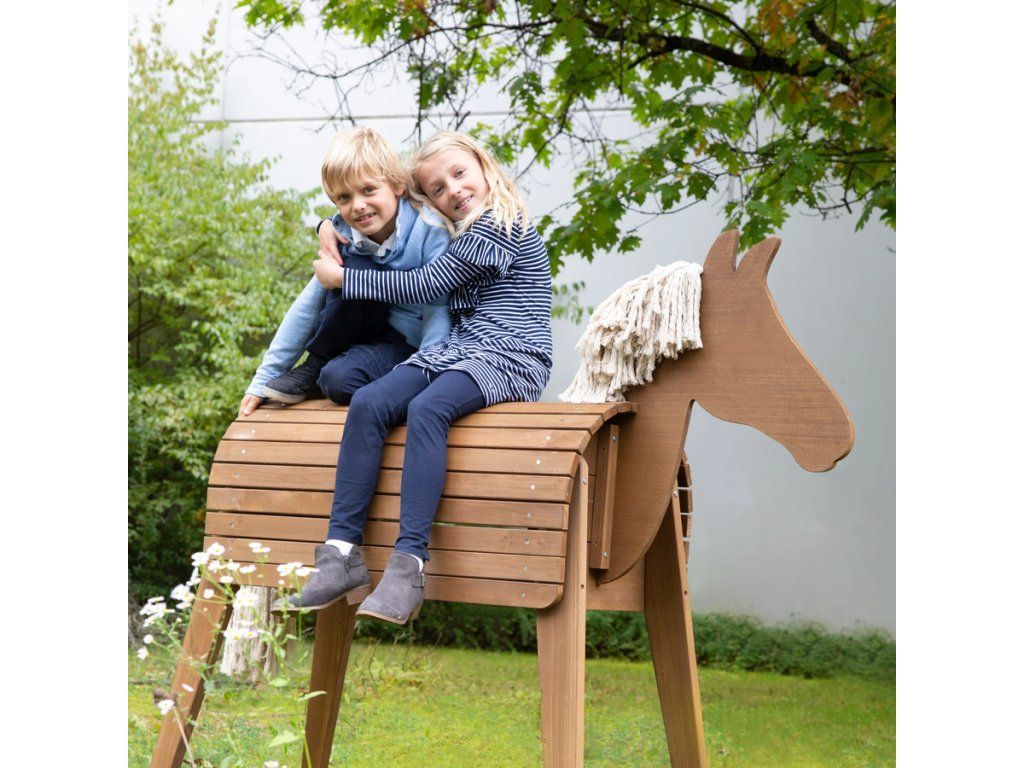 Vonkajší drevený kôň pre deti od 5 rokov ponúka nekonečné možnosti zábavy a rozvoja. Tento robustný a pevný kôň je perfektný pre hru na záhrade. Deti si môžu užívať lezenie, jazdu na koni, akrobatické cvičenie alebo gymnastiku. Kôň podporuje kreativitu a rozvoj jazdeckých techník. Hriva a chvost koňa sa dajú štýlovo upravovať alebo zaplietať, čo deťom poskytuje skutočný zážitok z jazdy na koni. Výška koňa v kohútiku je 89 cm. Vďaka výstuhe v tele je zaistená vysoká stabilita, čo je ideálne pre aktívne hry. Koňa môžu deti používať iba pod dohľadom dospelej osoby. Odporúčame ho cez noc prikryť, tak, aby bol chránený pred zvieratami (mačky, vtáky), ktorých by mohla prilákať jeho hriva a chvost. Kôň je vyrobený z masívneho dreva z udržateľných zdrojov. Odporúčame, aby záhradného koňa zostavovali dve dospelé osoby.