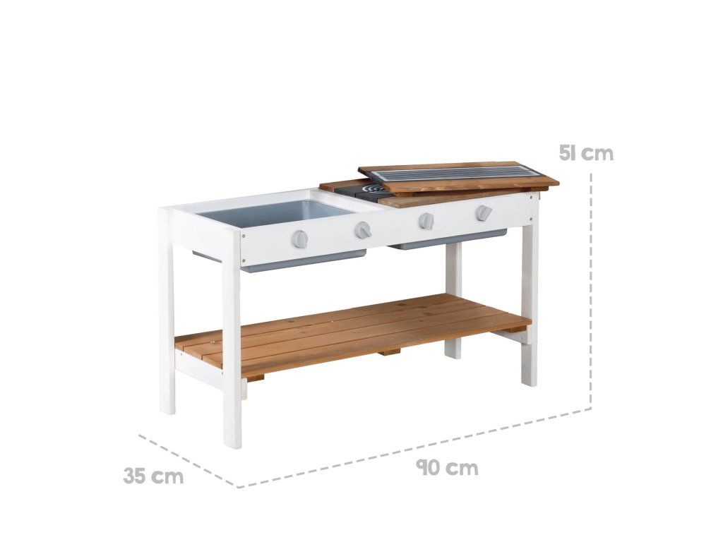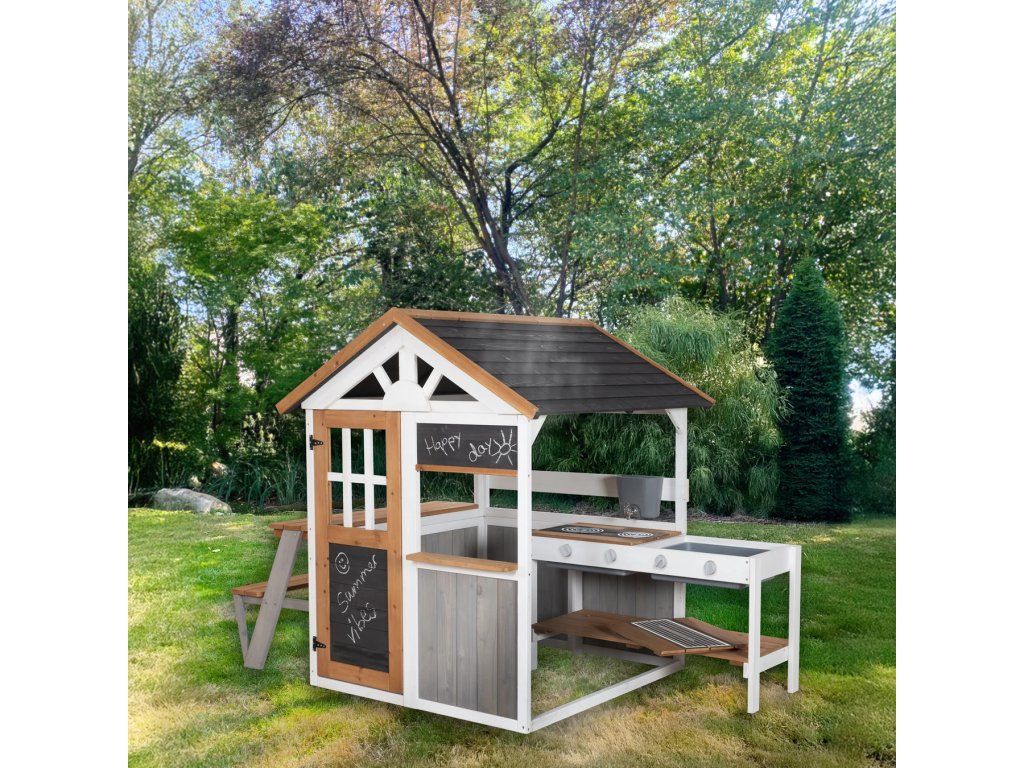 Domček má rozmery V 135 x Š 146 x H 105,5 cm a pracovnú výšku kuchyne 51 cm, čo poskytuje dostatok priestoru pre kreatívne hry. Výška sedadla piknikovej lavice je 29 cm. Deti sa môžu zahrať na vonkajšiu kuchyňu, stánok na trhu alebo usporiadať piknik. Hra podporuje rozvoj kreativity, sociálnych zručností a motoriky. Domček je vyrobený z kvalitných materiálov a má povrchovú úpravu odolnú voči poveternostným vplyvom. Vďaka pevnej konštrukcii je pre deti bezpečný. Domček sa ľahko premiestňuje, čo je ideálne pre rodiny, ktoré chcú flexibilne prispôsobiť záhradu alebo herný priestor potrebám svojich detí. Kvalitné materiály a pevná konštrukcia sú vhodné pre vonkajšie použitie.