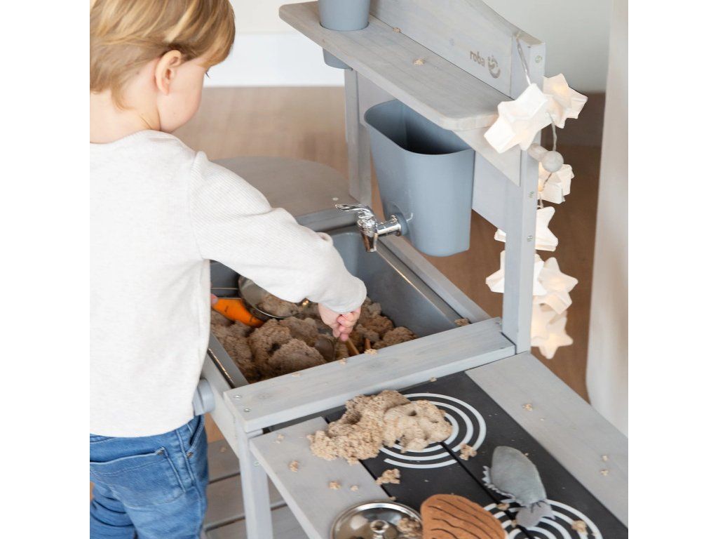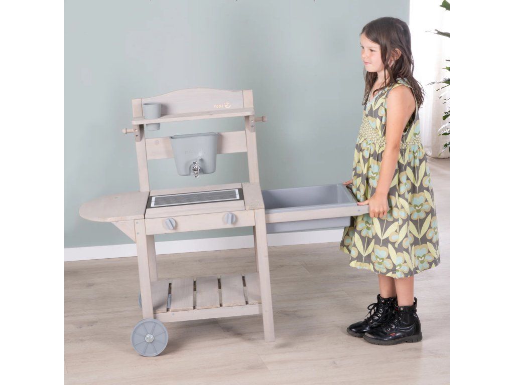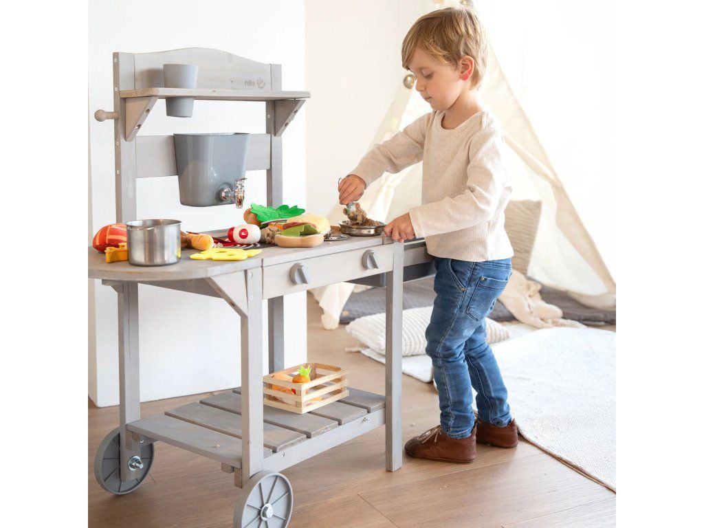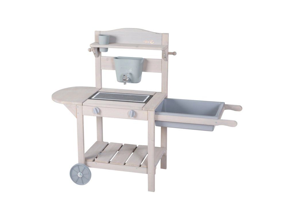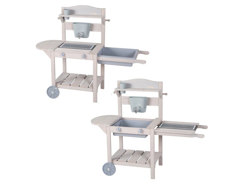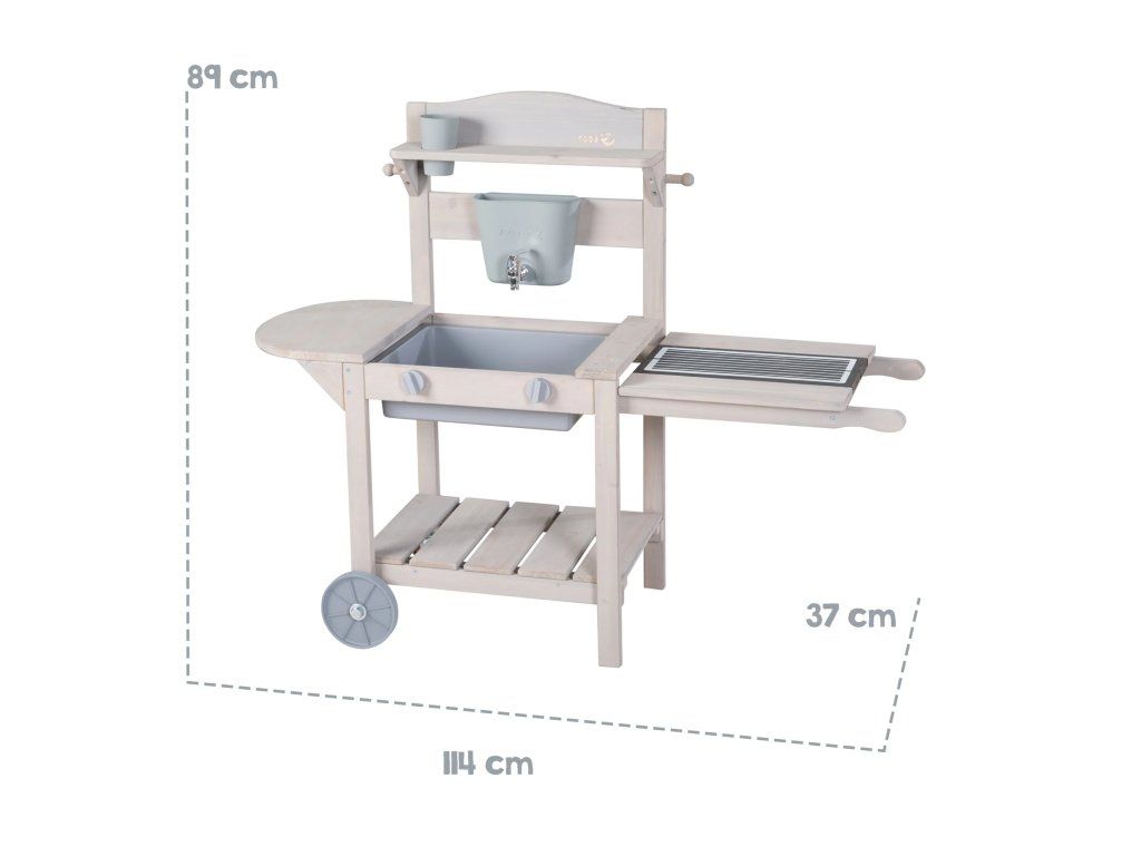 Mobilná detská kuchynka zaručí deťom množstvom zábavy pri objavovaní sveta varenia. Vďaka praktickým kolieskam ju možno ľahko presúvať, takže sa deti môžu hrať na záhrade, terase i doma. Kuchynka podporuje fantáziu, kreativitu i sociálne zručnosti pri spoločnej hre s kamarátmi. Súčasťou je bohaté príslušenstvo. Odnímateľná grilovacia plocha, otočné gombíky, plastová miska, hrnček, dva háčiky a nádoba na vodu s kohútikom. Deti tak môžu realisticky napodobňovať varenie, umývanie riadu alebo pripravovať pokrmy z piesku, vody i prírodných materiálov. Priestorná pracovná plocha poskytuje dostatok miesta pre kreatívnu hru.