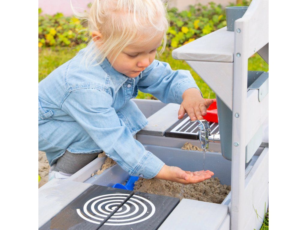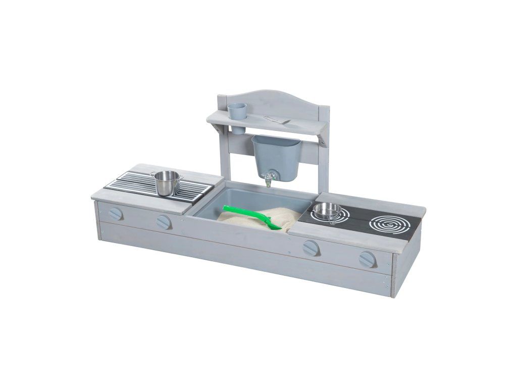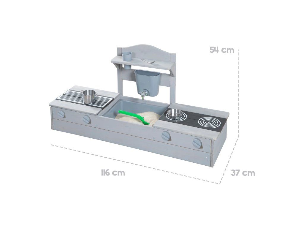 Praktické a priestorovo úsporné pieskovisko 2v1 s integrovanou kuchynkou pre deti od 12 mesiacov. Ideálne riešenie pre malé vonkajšie priestory, ako sú balkóny, terasy alebo záhrady. Súprava obsahuje dve odnímateľné sedadlá s motívom grilu a varnej dosky, plastovú hraciu vaničku, nádobu na vodu s kohútikom, hrnček a dva úložné priestory pre hračky či doplnky. Deti sa tak môžu hrať s pieskom aj vodou a alebo rozvíjať svoju fantáziu pri varení. Vďaka rozmerom sa pieskovisko perfektne hodí i na menšie balkóny, pritom stále poskytuje dostatok priestoru pre kreatívnu hru. Vyrobené z masívneho dreva pochádzajúceho z udržateľných zdrojov. Pieskovisko je vhodné pre dlhodobé vonkajšie použitie. Spĺňa bezpečnostné normy, takže hranie je bezpečné.