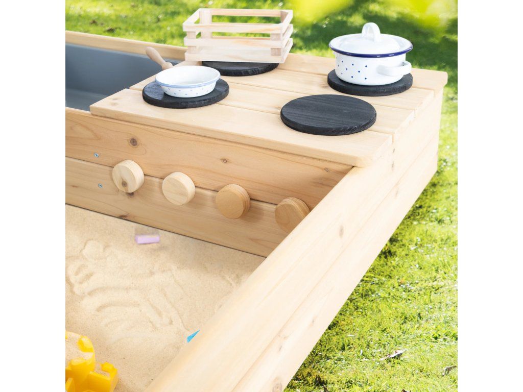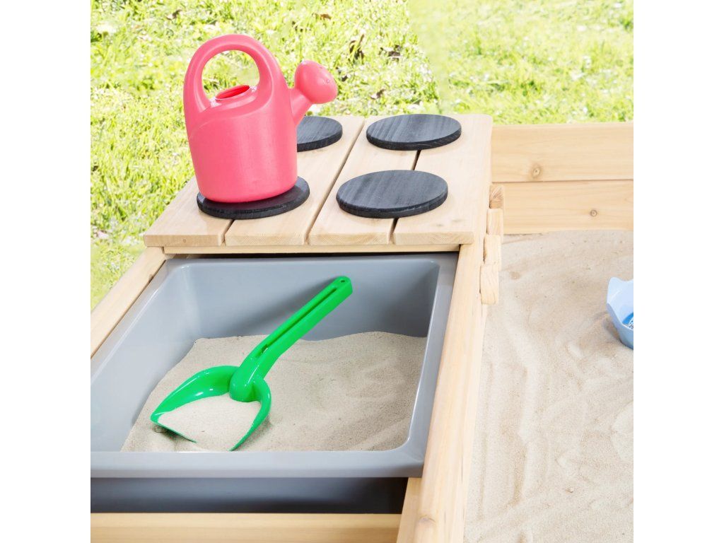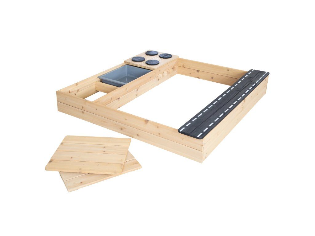 Pieskovisko s cestou pre autíčka a varnou doskou je vhodné pre deti od 12 mesiacov. Odnímateľná plastová nádoba umožňuje hru s vodou alebo pieskom. Deti sa môžu hrať s autami, stavať cesty alebo kombinovať pieskové a vodné hry, čím rozvíjajú motoriku a kreatívne myslenie. Varná doska pridáva ďalší rozmer zábavy. Deti môžu variť s pieskom, vodou či prírodnými materiálmi a rozvíjať predstavivosť a spoluprácu s kamarátmi. Vyberateľná plastová nádoba sa môže naplniť vodou, pieskom alebo poslúži na uloženie drobných hračiek. Pieskovisko je odolné voči poveternostným vplyvom a ľahko sa čistí. Je vyrobené z masívneho dreva s prírodnou povrchovou úpravou. Drevo pochádza z udržateľných zdrojov. Hladký povrch a zaoblené hrany zaisťujú hru bez rizika zranenia. Rozmery pieskoviska poskytujú dostatok priestoru pre hru viac detí naraz.