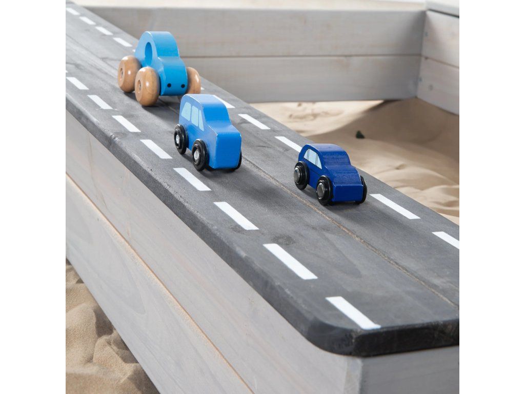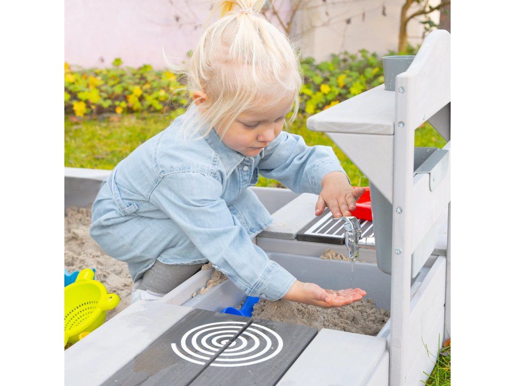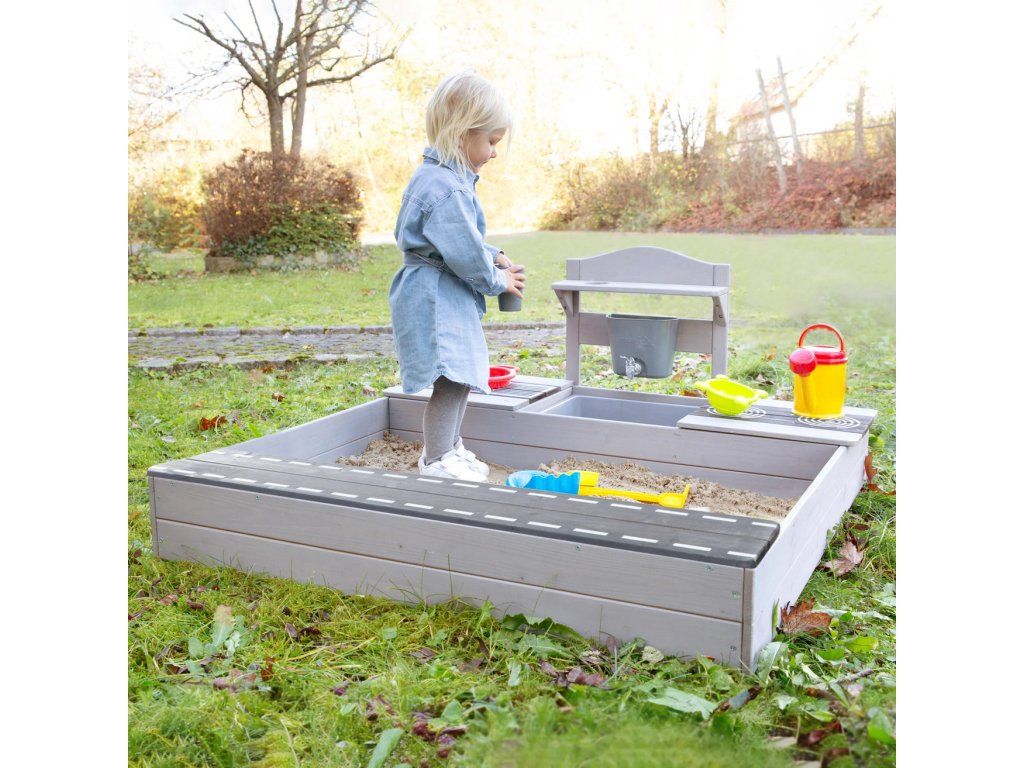 Toto premyslené pieskovisko z masívneho dreva v sivom vyhotovení ponúka deťom od 12 mesiacov ideálny priestor pre kreatívne hranie vonku. Vďaka integrovanej kuchynke si môžu užívať hru s pieskom, vodou aj doplnkami a vytvárať vlastné zábavné scenáre plné fantázie. Pieskovisko je vybavené hernou vaničkou a kuchynskou časťou s realistickými prvkami, ktoré deťom približujú skutočné varenie. Odnímateľné panely s motívom varnej dosky a grilu podporujú predstavivosť a rozširujú možnosti hry. Praktické úložné priestory pod nimi zaistia, že všetky hračky budú vždy prehľadne uložené. Nechýba ani pohodlné sedenie, ktoré deťom umožní odpočinok aj ďalšie hry. Zaoblené hrany, skryté spoje a stabilná konštrukcia zaisťujú bezpečné používanie aj pre najmenšie deti. Kvalitné masívne drevo pochádza zo zodpovedne obhospodarovaných zdrojov a je ošetrené tak, aby odolalo vonkajším podmienkam a dlhodobému používaniu. Pieskovisko spĺňa prísne európske bezpečnostné normy, takže sa deti môžu hrať bez obáv.
