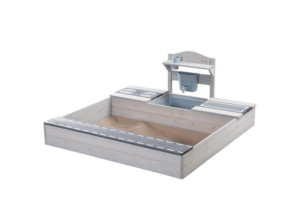 ROBA – pieskovisko s kuchynkou na vodu a piesok a s lavicou – sivé