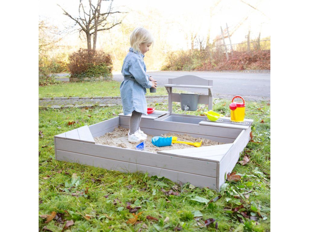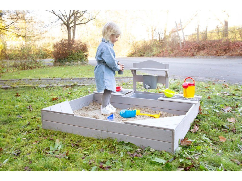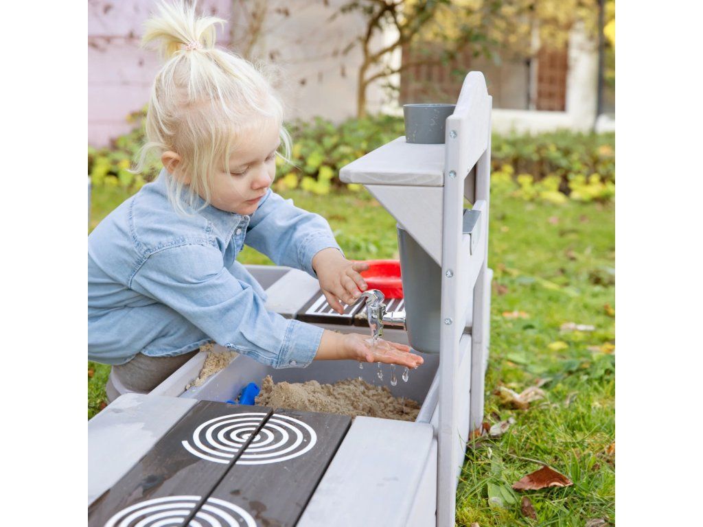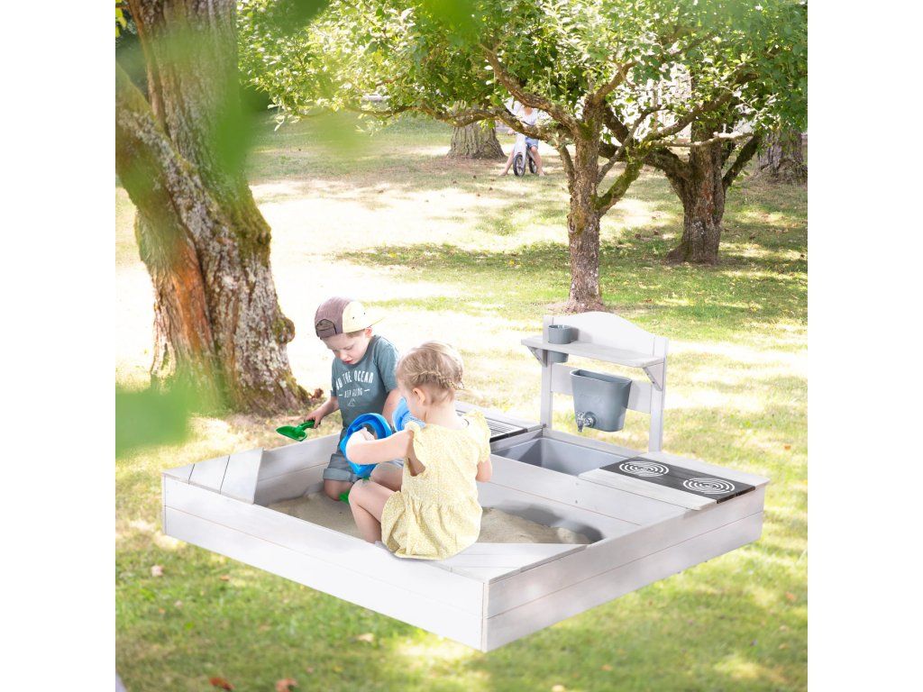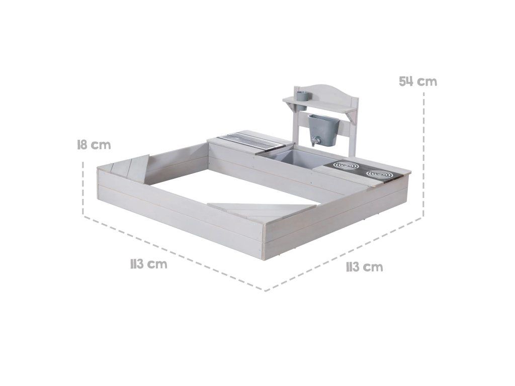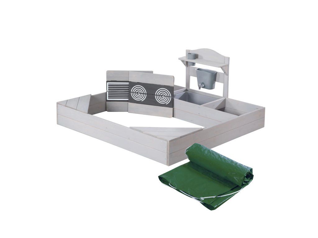 Pieskovisko z masívneho dreva ponúka deťom od 12 mesiacov priestor pre nekonečnú zábavu i objavovanie. Vďaka integrovanej kuchynke sa deti môžu hrať s pieskom, vodou aj doplnkami a vytvárať vlastné malé kuchárske dobrodružstvo na záhrade, terase alebo i väčšom balkóne. Súčasťou sú dva odnímateľné panely s realistickým motívom varnej dosky a grilu, ktoré podporujú detskú fantáziu a robia hru ešte zábavnejšou. Pod nimi sa nachádzajú praktické úložné priestory, kam si deti môžu upratať hračky, formičky alebo riad. Nechýba ani nádoba na vodu s kohútikom a hrnček, vďaka ktorým si deti môžu užiť interaktívnu hru. Pre pohodlné hranie sú v rohoch pieskoviska umiestnené dve sedacie plochy, ktoré deťom poskytujú miesto k odpočinku i ďalším aktivitám.