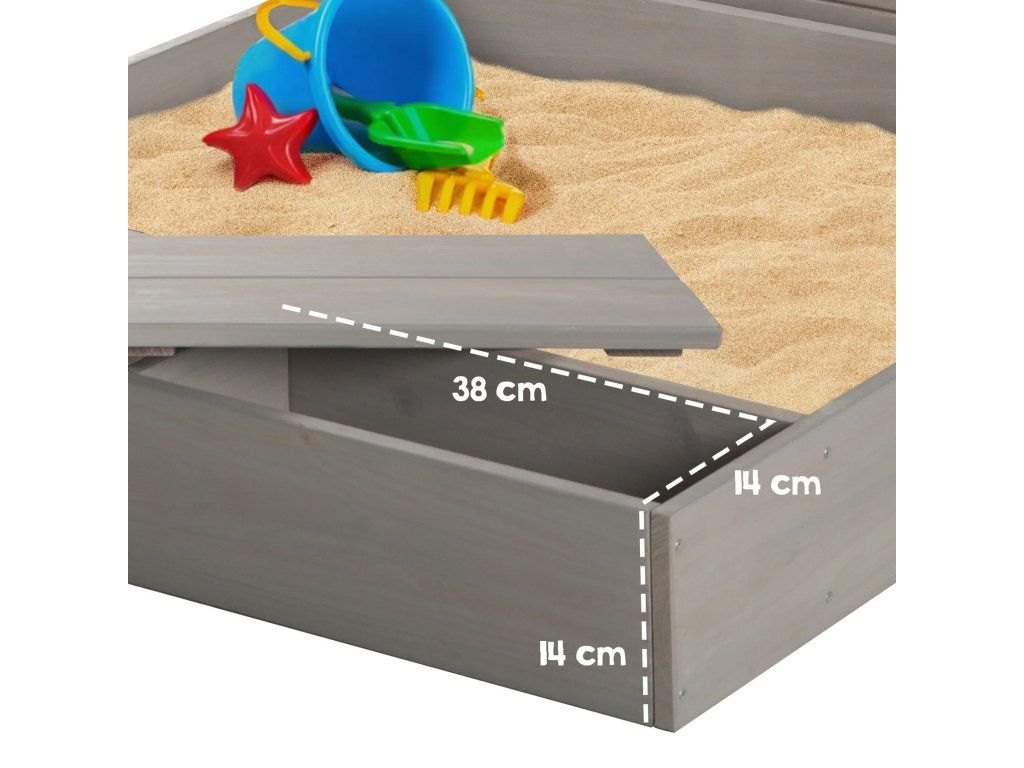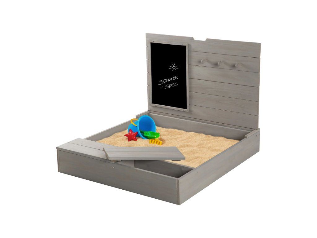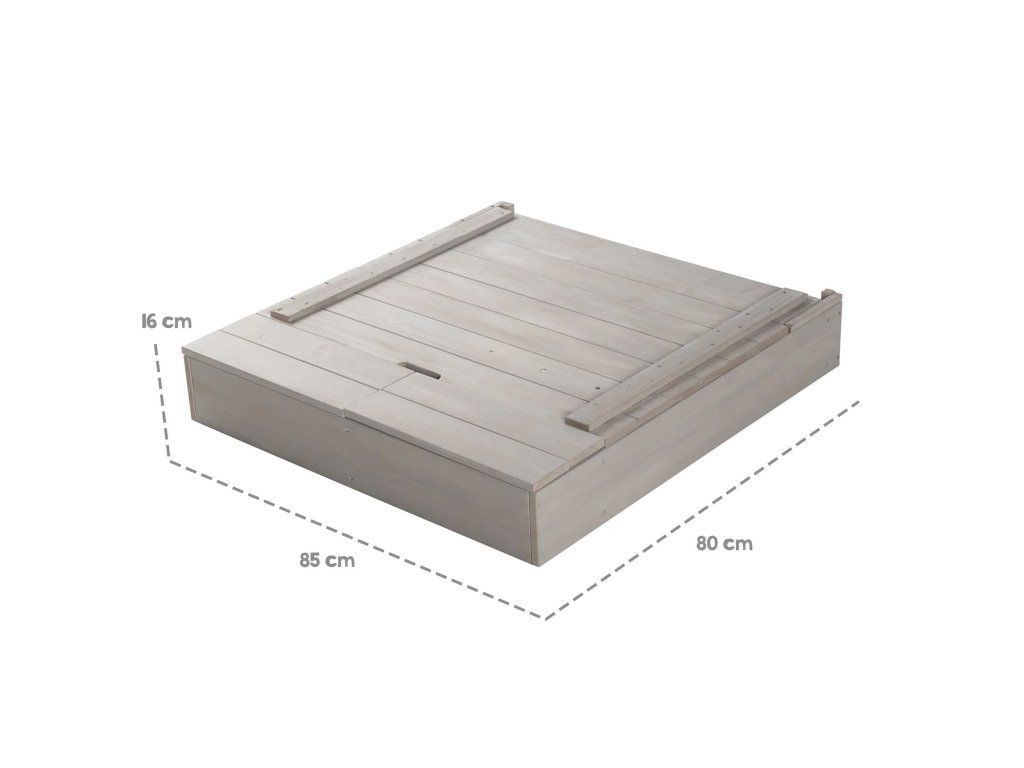 Drevené pieskovisko s vekom, tabuľou a úložným priestorom pre deti od 12 mesiacov. Vďaka praktickému veku, ktoré možno ľahko zdvihnúť do strany, vznikne hracia stena s tabuľou a tromi háčikmi na doplnky alebo hračky. Pieskovisko je ideálne pre menšie záhrady alebo terasy, kde poskytne deťom dostatok priestoru pre hru s pieskom aj kreslenie. Na jednej strane má pieskovisko menší úložný priestor, kam možno schovať hračky. Masívne drevo so sivou lazúrou pochádza z udržateľných zdrojov, je odolné voči poveternostným vplyvom a vhodné pre vonkajšie použitie. Stabilná konštrukcia a kvalitné spracovanie zaisťujú dlhú životnosť.