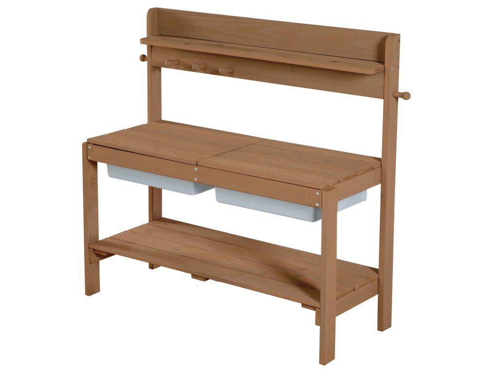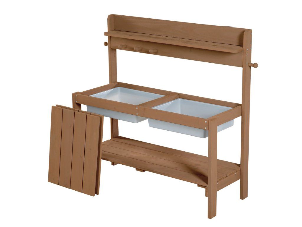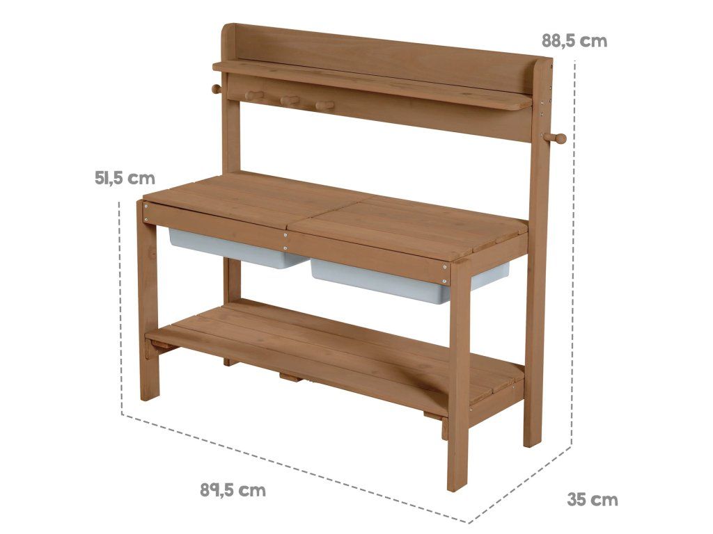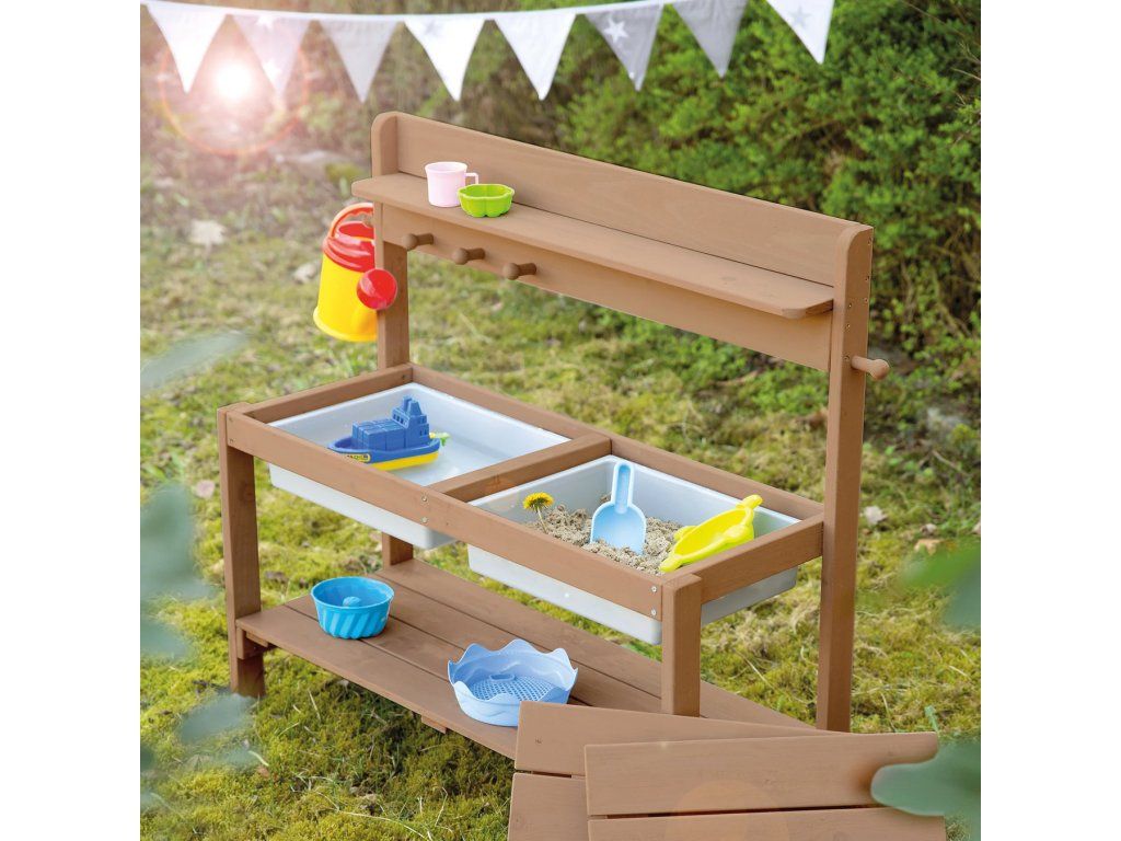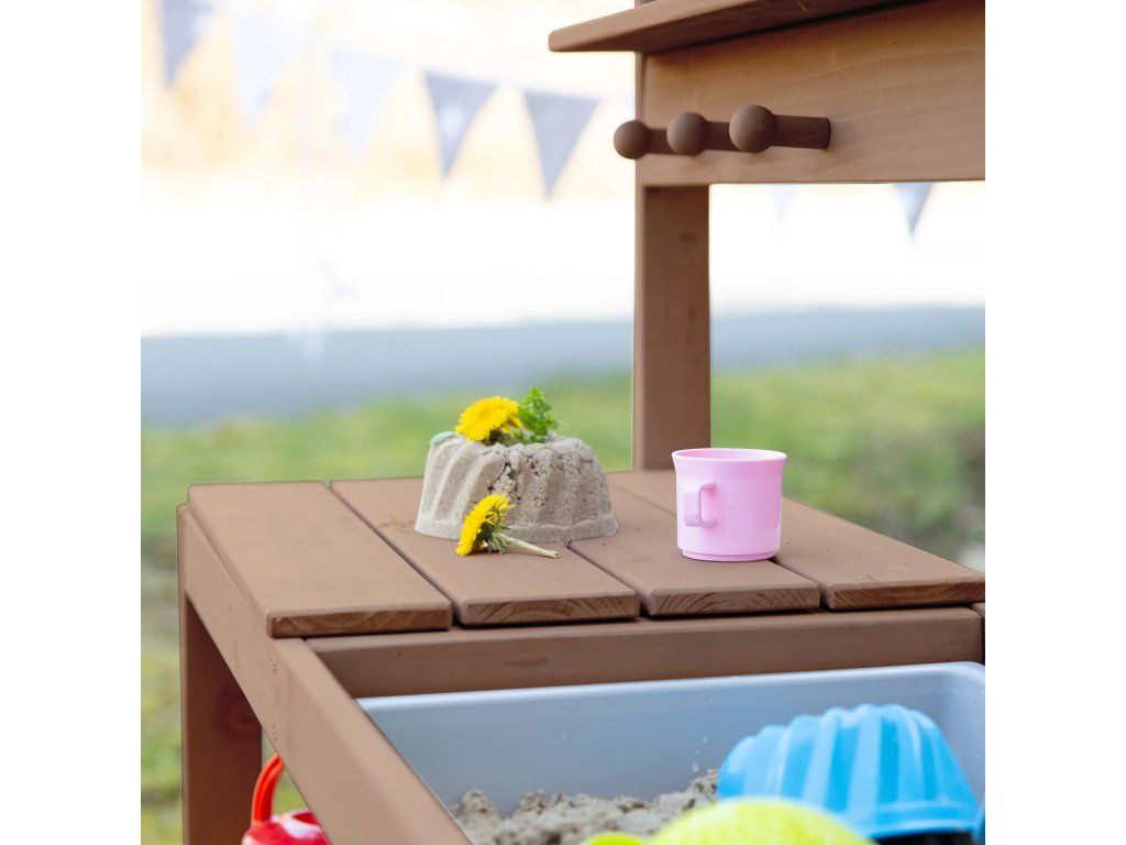 Vonkajšia kuchynka je vyrobená z kvalitného, poveternostným vplyvom odolného moreného masívneho dreva, čo ju činí ideálnou pre hranie s pieskom a vodou. Je určená pre deti od 18 mesiacov do 8 rokov a má nosnosť až 25 kg. Kuchynku možno umiestniť na záhradu, terasu aj do vnútorných priestorov. Možno ju tiež premeniť na stôl na tvorenie s úložným priestorom na kreatívne potreby (ceruzky, modelovacia hmota a ďalšie materiály). Vďaka stabilnej konštrukcii bez viditeľných skrutiek v horných doskách a zaobleným rohom je zaručená maximálna bezpečnosť pre deti. Súčasťou tejto všestrannej kuchynky sú 2 odnímateľné plastové drezy, úložná polička a praktické háčiky. Kuchynka je odolná a ľahko sa udržuje. Všetky materiály použité pri výrobe sú testované na škodlivé látky. Montáž je ľahká vďaka priloženému návodu.