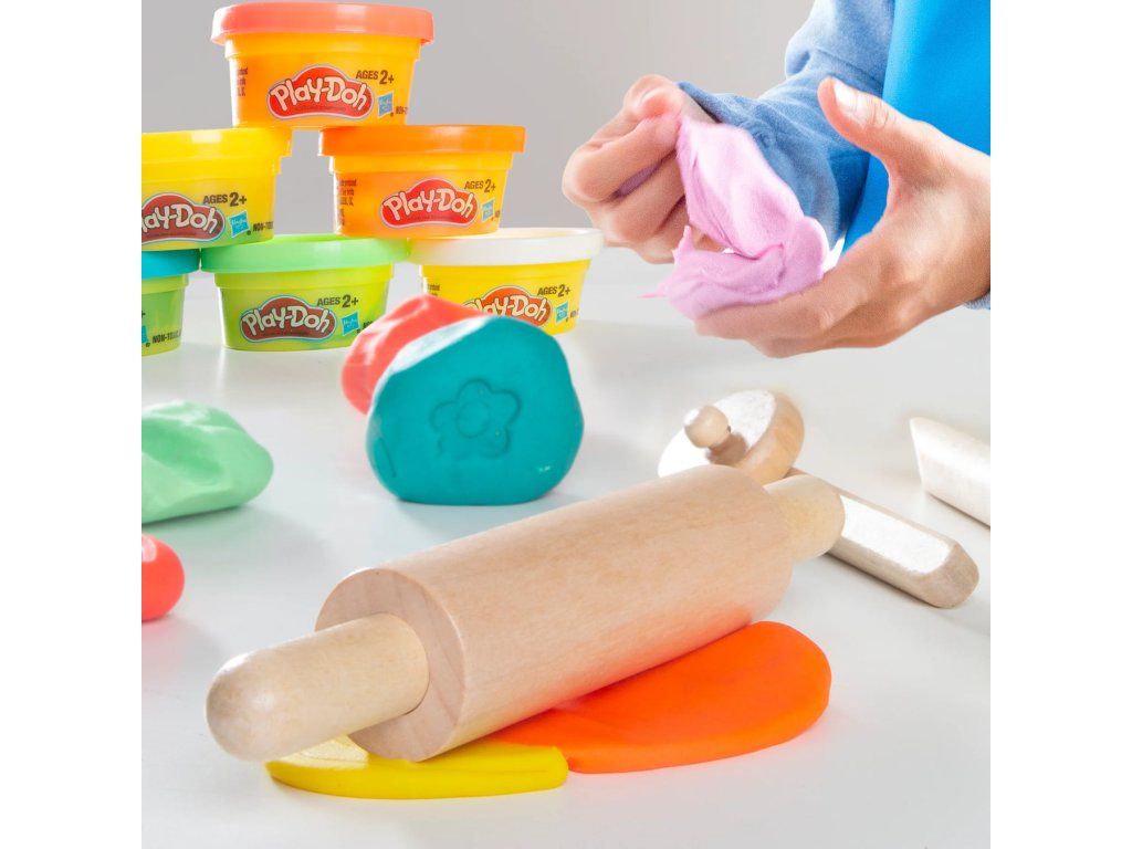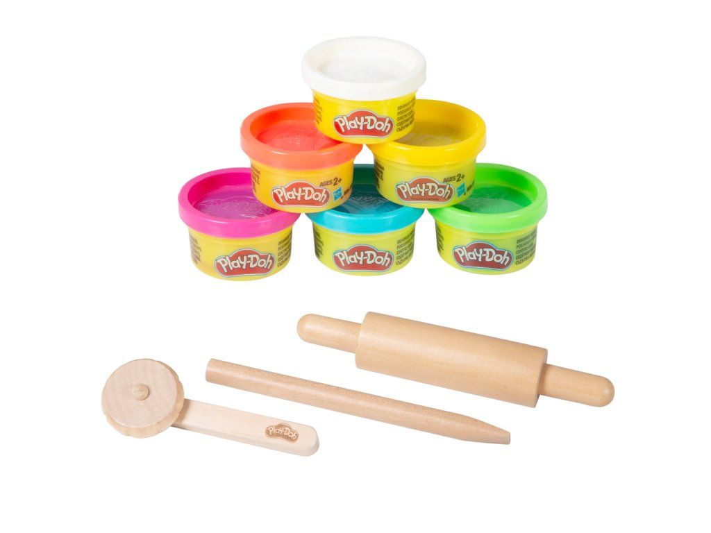 Príslušenstvo: Dve hracie plochy, vrátane varnej dosky, plastový drez a nádržka na vodu s kohútikom, hrnček, otočný gombík a dva háčiky na zavesenie kuchynského náčinia, kreatívna podložka so vtipnými tvárami, formičkami na modelovaciu hmotu, drevený modelovací nástroj, valček, krájač na pizzu, farebná plastelína Play-Doh: 6 plechoviek po 28 g (červená, žltá, modrá, zelená, biela, lesná farba), plátenná škatuľa na doplnky a náčinie.