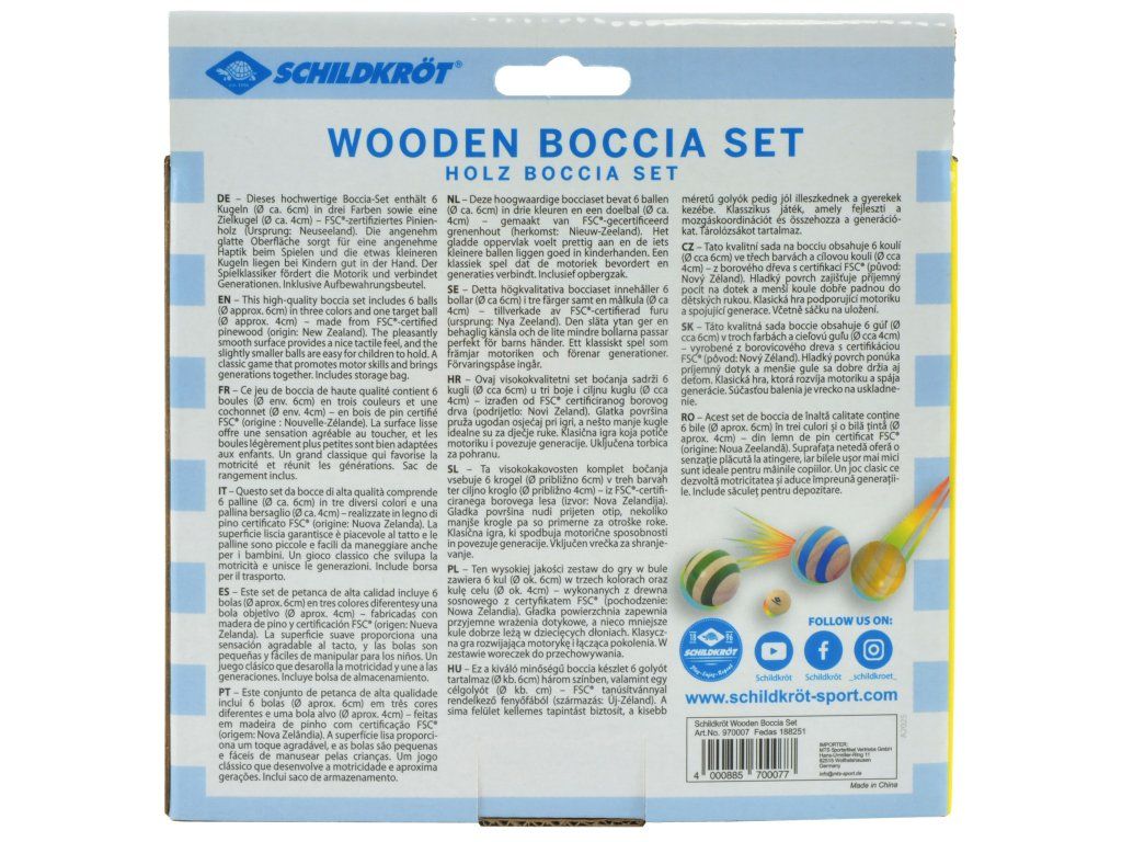 Súprava Schildkröt Boccia vyrobená z borovicového dreva zo zodpovedne obhospodarovaných zdrojov je perfektnou klasickou vonkajšou hrou pre celú rodinu. Obsahuje 6 farebných loptičiek (O 6 cm) v troch farbách a jednu terčovú loptičku (O 4 cm). Hra je ideálna pre napínavé súťažné výzvy na záhrade, v parku alebo na pláži. Vďaka hladkému povrchu a pohodlnej veľkosti sa s loptičkami zvlášť ľahko manipuluje a to aj deťom. Hádzanie, mierenie a meranie hravou formou pomáhajú rozvíjať motorické zručnosti a koordináciu. Súprava je dodávaná v praktickom úložnom vrecúšku so sťahovacou šnúrkou, čo uľahčuje prepravu a skladovanie. Nech už na pikniku, narodeninovej oslave alebo kempovaní, hra Boccia prináša zábavu, čerstvý vzduch a kvalitne strávený čas s rodinou a priateľmi. Rozmery balenia: 18,5 x 15,5 x 6,2 cm Hmotnosť: 0,34 kgDodatočné parametre