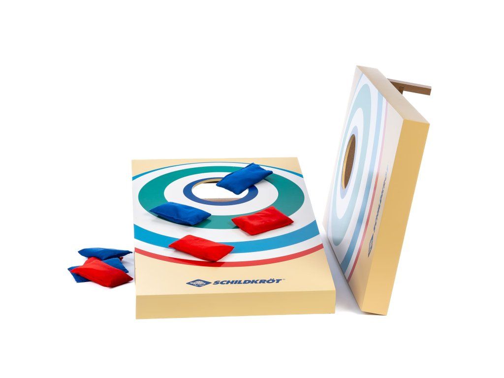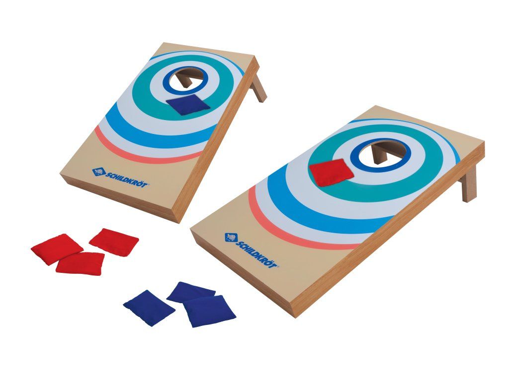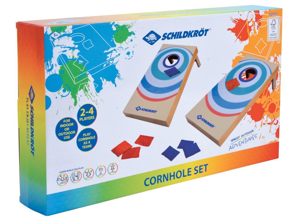 Súprava Schildkröt Cornhole je zábavná voľnočasová hra pre 2 – 4 hráčov, ktorá vyžaduje zručnosť a dobrú mušku. V tejto americkej obľúbenej hre je potrebné hodiť 4 červené a 4 modré vrecúška s pieskom do otvoru v dvoch šikmých častiach cieľovej dosky (52 x 30 x 14 cm). Súprava obsahuje 2 drevené dosky so skladacími nohami a 8 látkových vrecúšok naplnených pieskom (4 červené/4 modré). Zásah do otvoru má hodnotu 3 bodov, zásah do dosky má hodnotu iba 1 bod. Ideálna hra pre vonkajšie hranie s priateľmi, ktorú si môžete vziať so sebou kamkoľvek cez víkend alebo na dovolenku. Vyrobené z MDF dreva, ktoré pochádza zo zodpovedne obhospodarovaných lesov.Dodatočné parametre