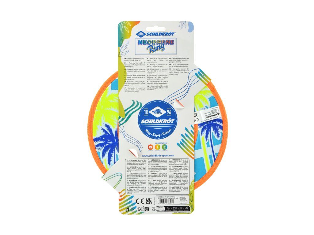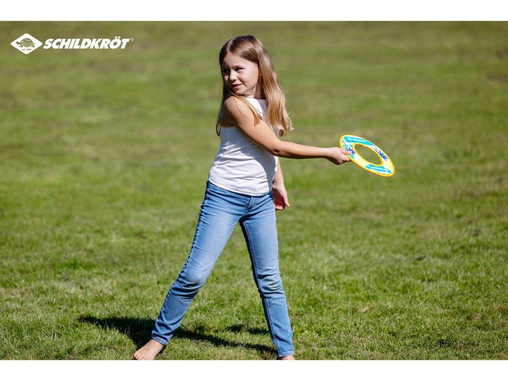Neoprénový kruh Frisbee (O 24 cm) od Schildkröt kombinuje skvelé aerodynamické vlastnosti s nízkym rizikom zranenia. Do mäkkého, protišmykového neoprénového materiálu je všité jadro z umelej kože, ktoré kruhu dodáva o niečo väčšiu váhu. Vďaka tomu sa mäkký neoprén počas letu stabilizuje a kruh lieta veľmi presne a ďalej. Materiál, z ktorého je Frisbee vyrobené sa dobre drží a umožňuje tak ľahké hádzanie aj chytanie. Neoprénový kruh Schildkröt je odolný voči slanej vode a rýchlo schne, čo z neho robí ideálneho spoločníka na pláž a k moru.Dodatočné parametre