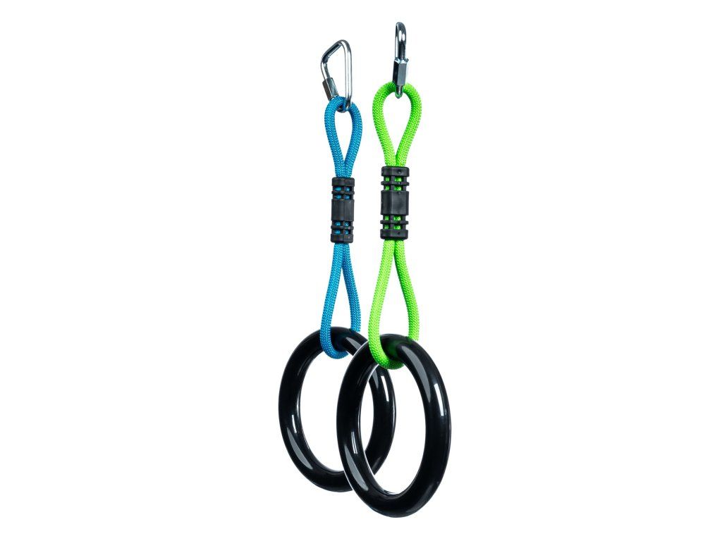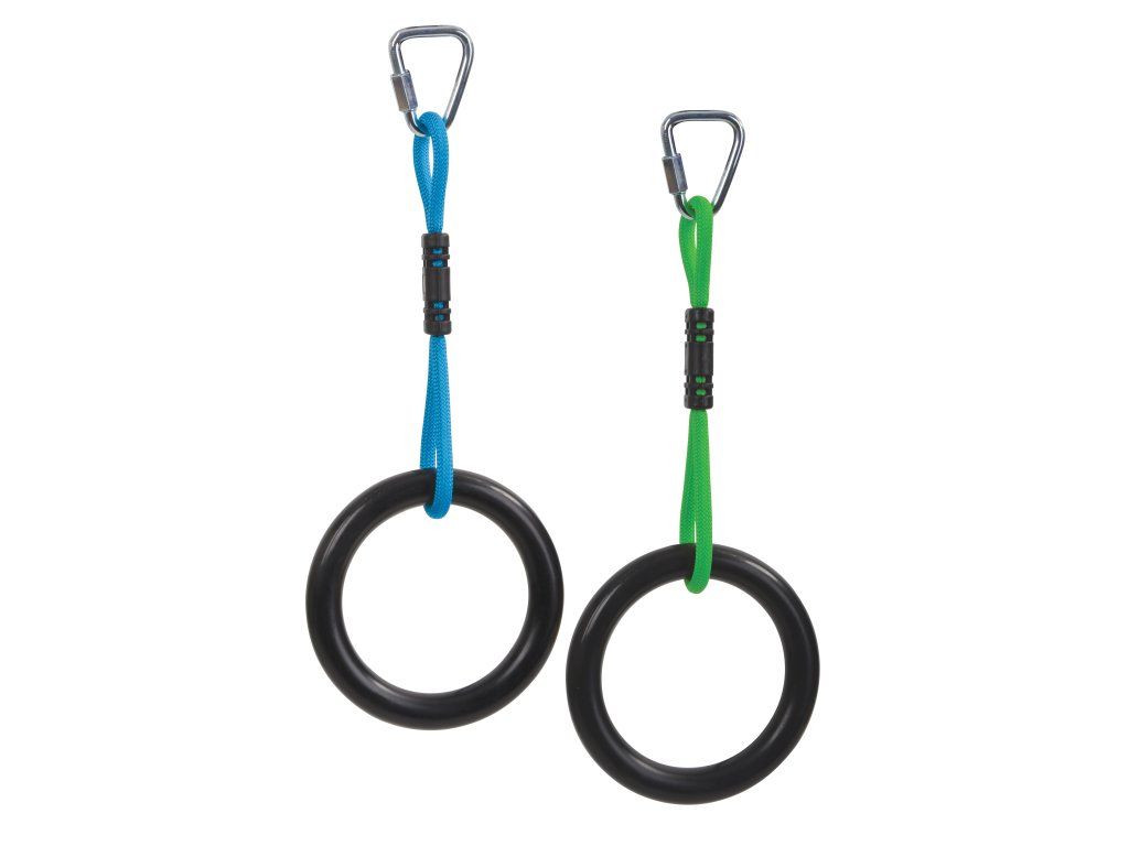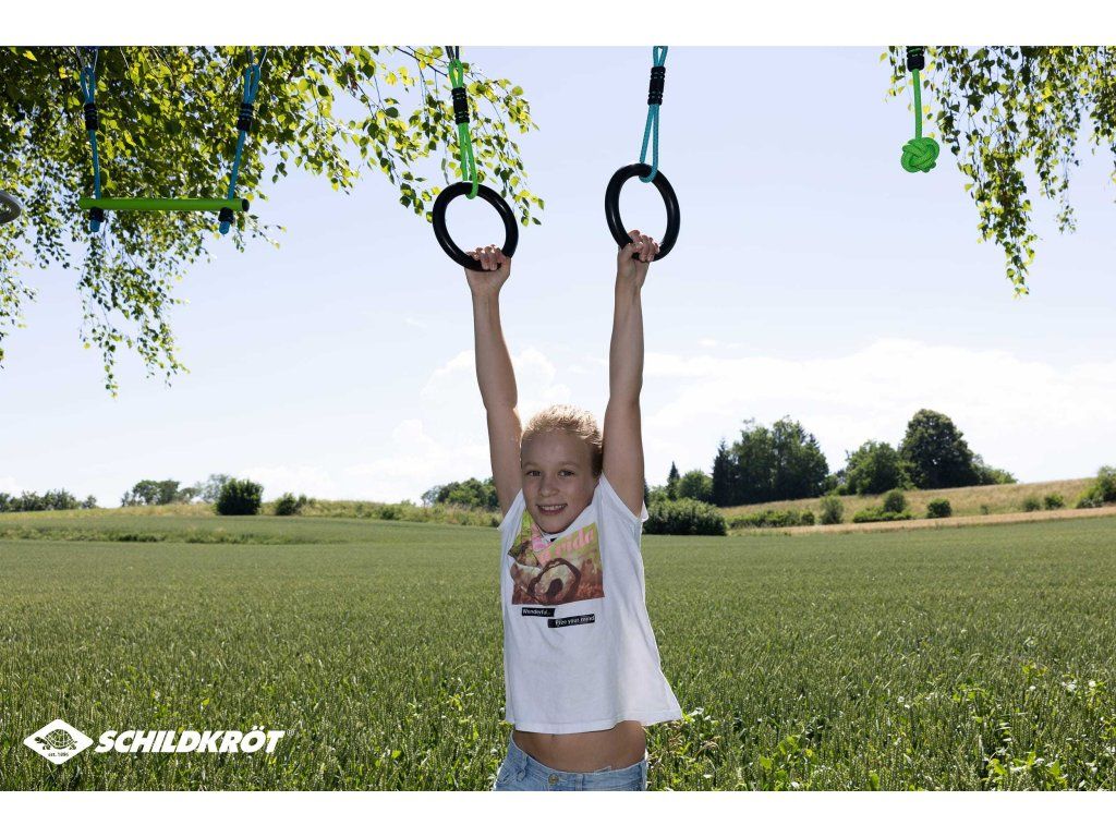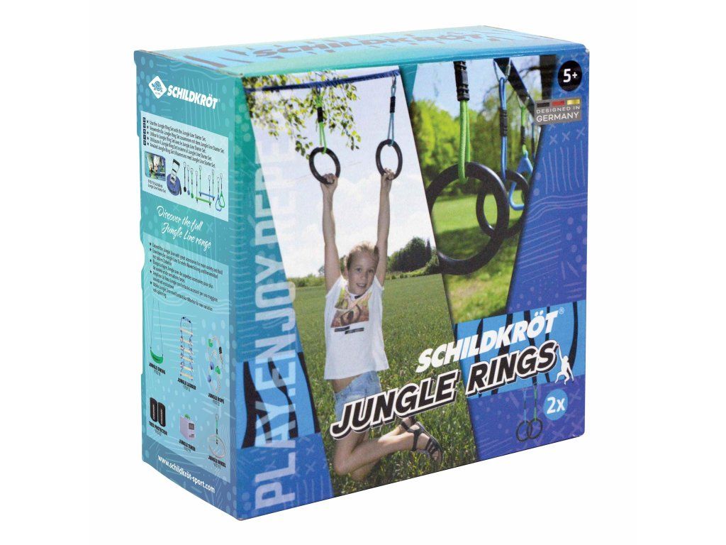 Súprava gymnastických kruhov Schildkröt skvele dopĺňa rad lanovej prekážkovej dráhy Jungle a pridáva tak ešte viac výziev k tejto dráhe. Dajú sa tiež využiť ako samostatné gymnastické kruhy, ktoré možno pripevniť napríklad namiesto hojdačky. Deti si môžu posilniť paže a horné časti tela, a pritom sa baviť. Súprava obsahuje 2 kruhy (O 18 cm) pripevnené k 25 cm dlhému nylonovému lanu odolnému proti UV žiareniu. Sú ľahko a pohodlne uchopiteľné a spôsobujú minimálne otlaky. Súčasťou balenia sú 2 bezpečnostné karabíny pre pripevnenie. Odporúčané deťom od 5 rokov, pre vonkajšie použitie. Maximálna nosnosť: 1 osoba do 120 kg.Dodatočné parametre