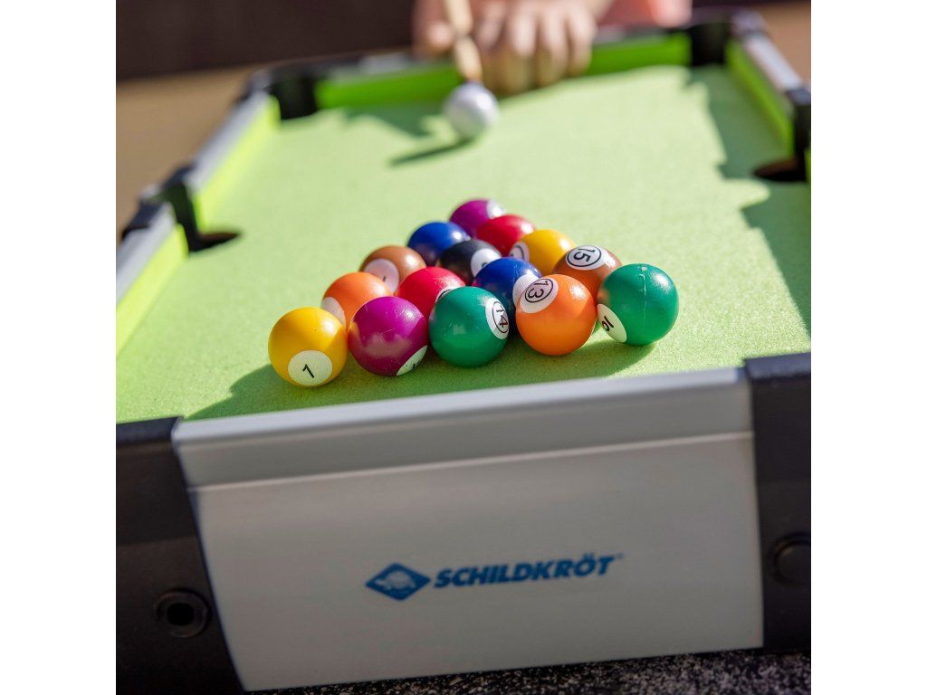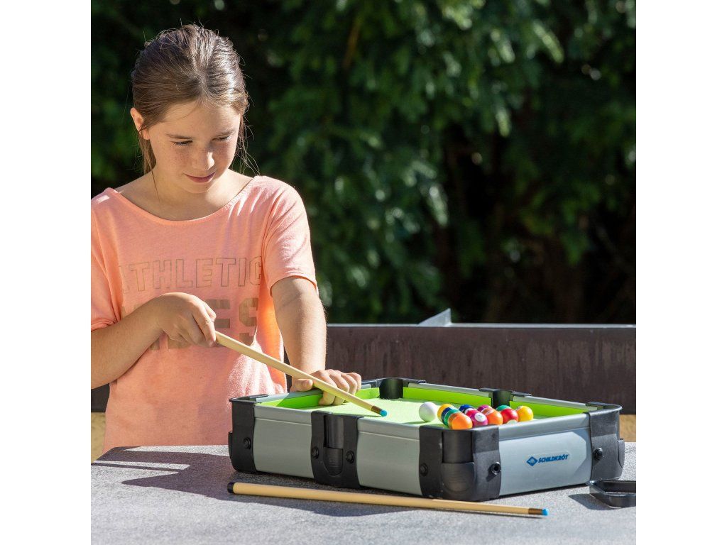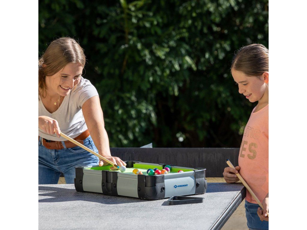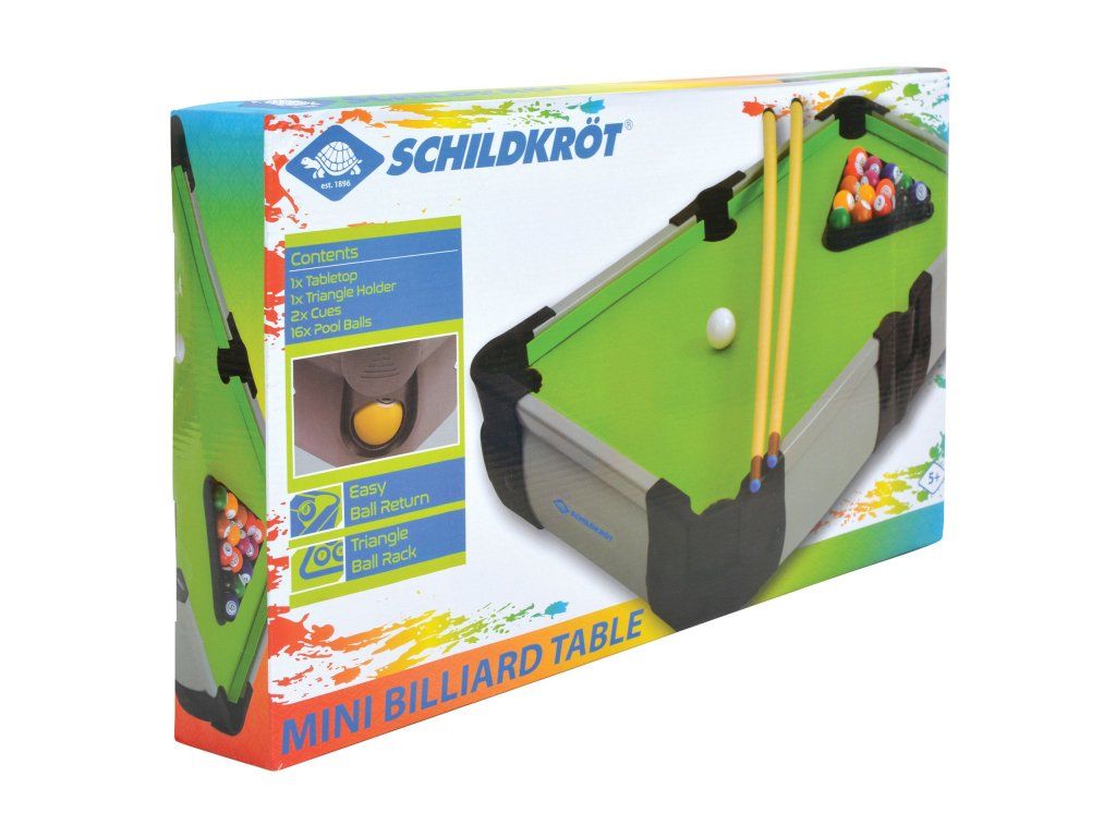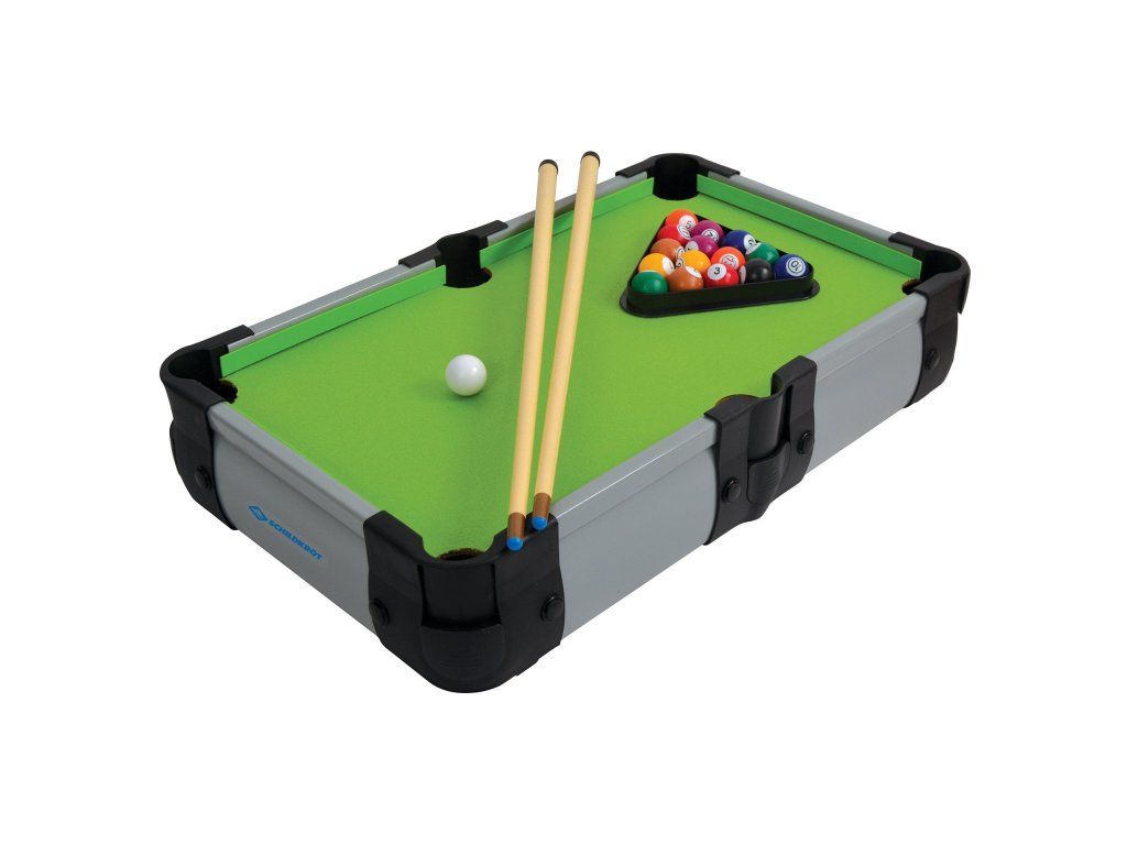 Mini biliardový stôl ponúka perfektnú zábavu pre každú príležitosť. Je všestranný a vďaka rozmerom 50 × 30 × 9 cm a nízkej hmotnosti iba 1,3 kg sa ľahko prenáša aj skladuje. Je preto ideálny domov, na párty alebo na cesty. Stôl je vyrobený z odolného plastu a vďaka protišmykovým nožičkám stabilne drží na stole či inej rovnej ploche. Súčasťou súpravy sú 2 tága s dĺžkou 50 cm, 16 biliardových gúľ s priemerom 2,6 cm a trojuholník pre ich usporiadanie. Gule po zahratí zapadnú do jedného zo 6 plastových vreciek a možno ich ľahko vybrať pomocou praktického posuvného mechanizmu. Hra pre deti od 5 rokov pomáha hravou formou rozvíjať koordináciu ruka–oko. Rozmery balenia: 51 x 31 x 7,5 cm Hmotnosť: 1,3 kgDodatočné parametre