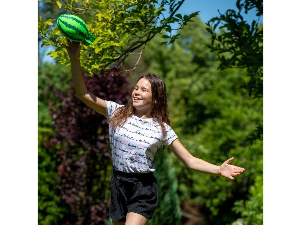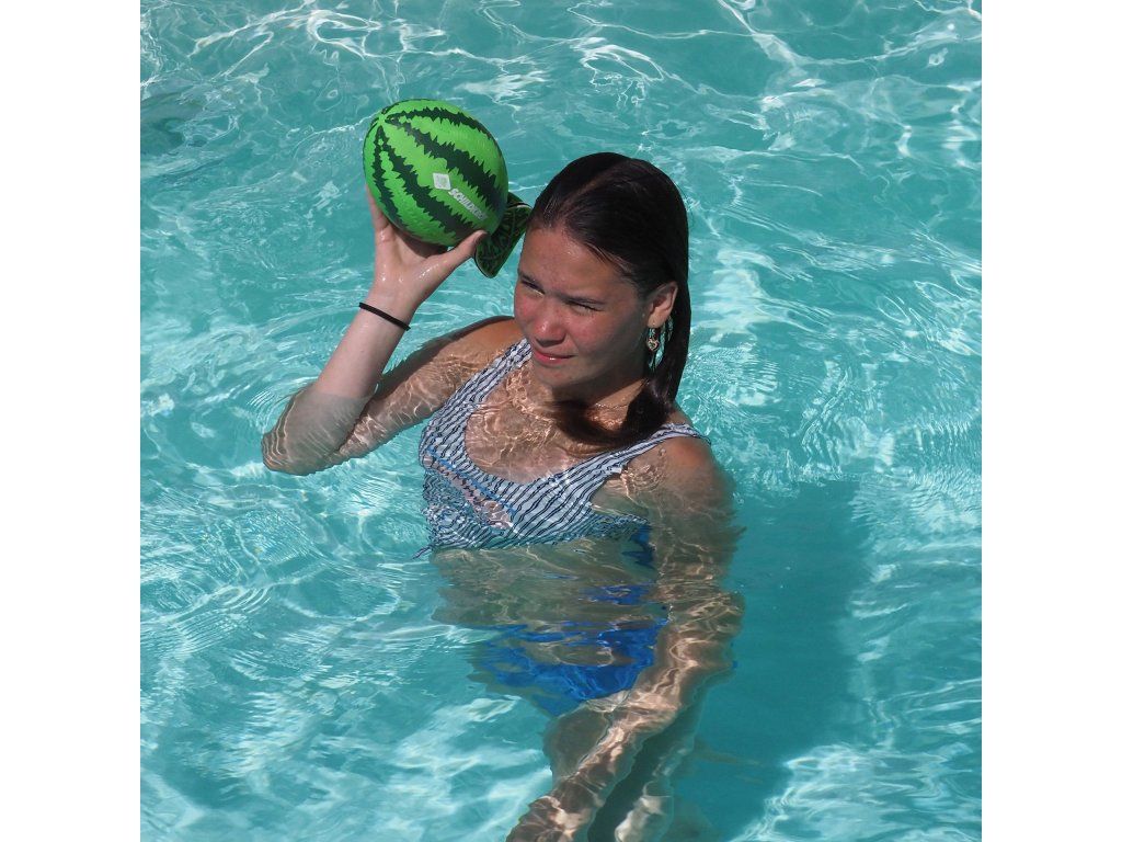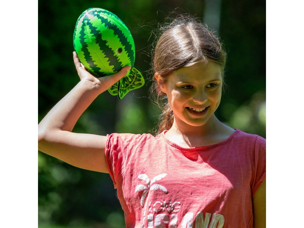 Vodná lopta v tvare melónu je skvelým spoločníkom na pláž, k jazeru aj k bazénu. Vďaka aerodynamickému tvaru ju môžete hádzať podobne ako loptu na americký futbal alebo na rugby. Lopta ľahko lieta vzduchom aj kĺže nad hladinou vody. Veselý melónový dizajn navyše zaručene upúta pozornosť pri každej letnej hre. Lopta má mäkký neoprénový povrch s protišmykovou úpravou, ktorá uľahčuje chytanie. Je ľahká (cca 135 g) a má rozmery približne 25 × 13 cm, takže je vhodná pre deti aj dospelých. Hranie s loptou zároveň pomáha trénovať koordináciu rúk a očí i techniku hodu. Lopta je vybavená nafukovacím ventilom (odporúčaný tlak max. 0,2 baru).Dodatočné parametre
