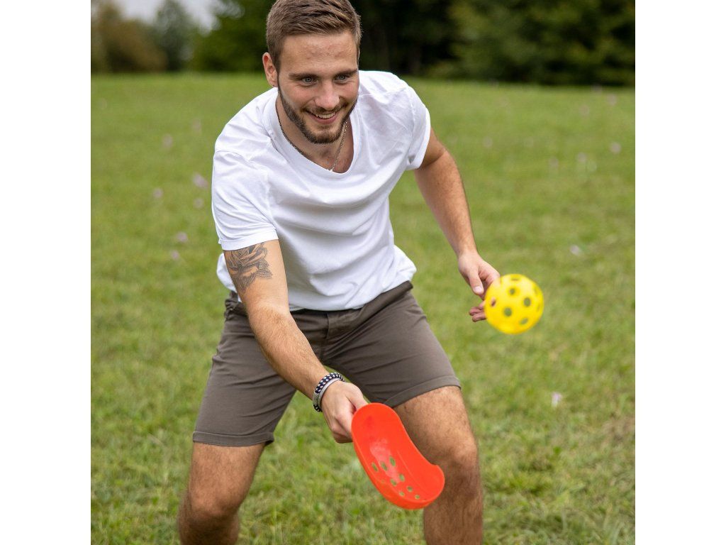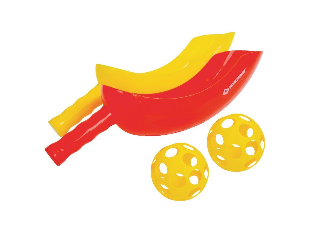 Outdoorová hra Scoop Ball obsahuje 2 lapače z odolného plastu (37 cm) v červenej a žltej farbe a dve loptičky s priemerom 8 cm. Tie sú navrhnuté tak, aby sa dali ľahko chytiť a umožňovali variabilné techniky hádzania. Táto obľúbená zručnostná hra podporuje koordináciu a preverí schopnosť rýchlej reakcie. Loptička sa hádže buď zospodu, alebo zhora smerom k druhému hráčovi. Pri hre musí spoluhráč rýchlo reagovať a katapultovať loptičku späť. Lapače majú zaoblené rukoväte bez hrán pre pohodlné držanie a ľahko sa s nimi manipuluje. Hra podporuje rozvoj motoriky, obratnosti a koordinácie. Výhodou je nízka hmotnosť celej súpravy, ktorú si tak môžete zbaliť na dovolenku alebo na výlet do prírody.Dodatočné parametre