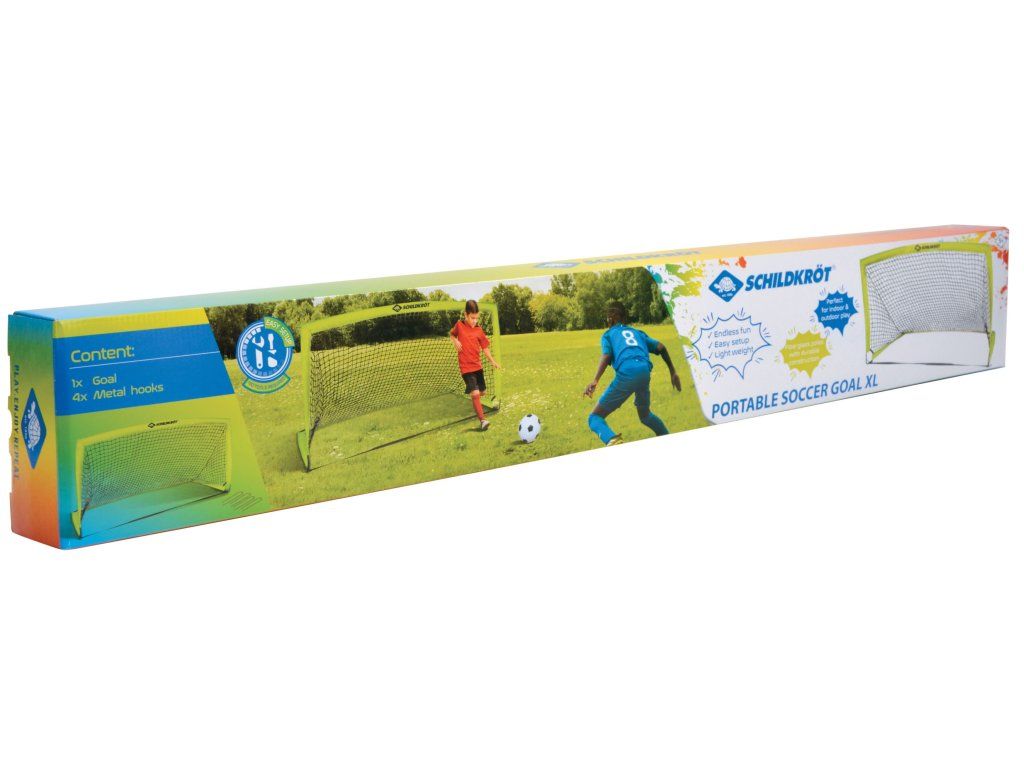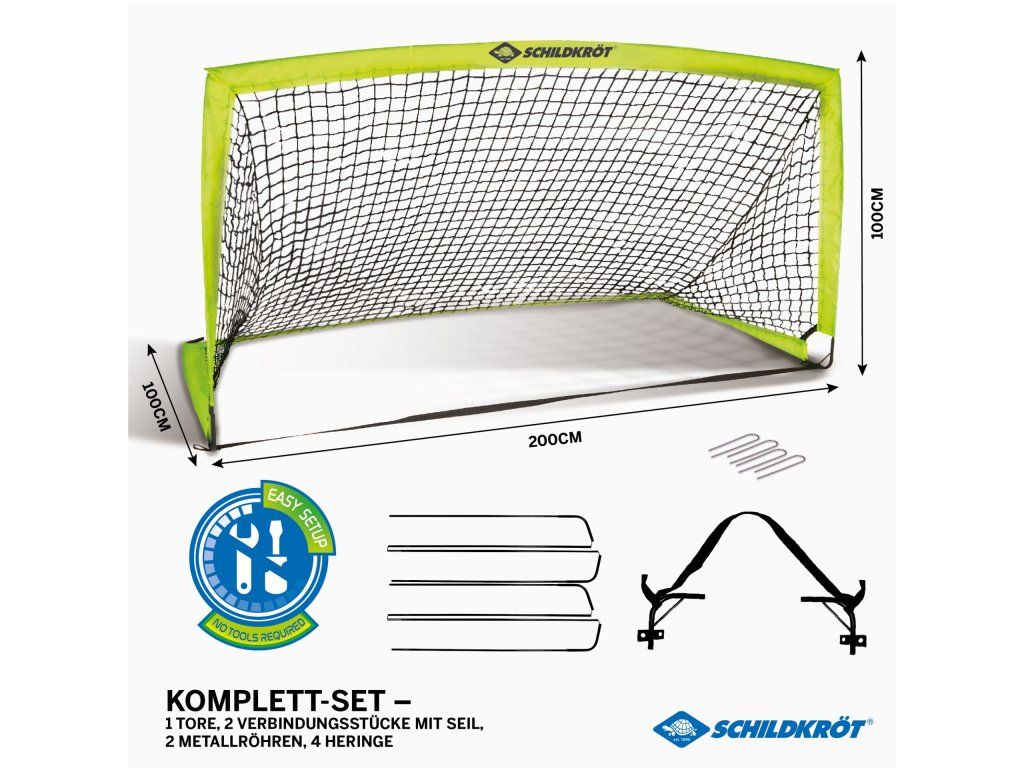 S futbalovou bránkou Schildkröt XL si užijete množstvo zábavy a tréningu. S rozmermi 200 × 100 × 100 cm je ideálna pre rôzne loptové športy ako futbal, hádzanú alebo hokej. Vďaka robustnému kovovému rámu je bránka stabilná a odolná, pričom jej rýchla montáž nevyžaduje žiadne nástroje, takže ju ľahko zostavíte počas niekoľkých minút. Bezpečné ukotvenie pomocou 4 kovových kolíkov zaistí stabilitu i pri vetre alebo pri silných strelách. Vďaka skladacej konštrukcii je ľahko prenosná a po použití sa dá kompaktne uložiť, čo je ideálne pre rodiny s obmedzeným priestorom. XL bránka je perfektná pre záhradné hry, športové tréningy alebo narodeninové oslavy. Skvele sa hodí pre deti, tínedžerov aj dospelých, ktorí si chcú užiť futbal alebo iné loptové hry s rodinou a priateľmi. VAROVANIE: Montáž môžu robiť iba dospelé osoby!Dodatočné parametre