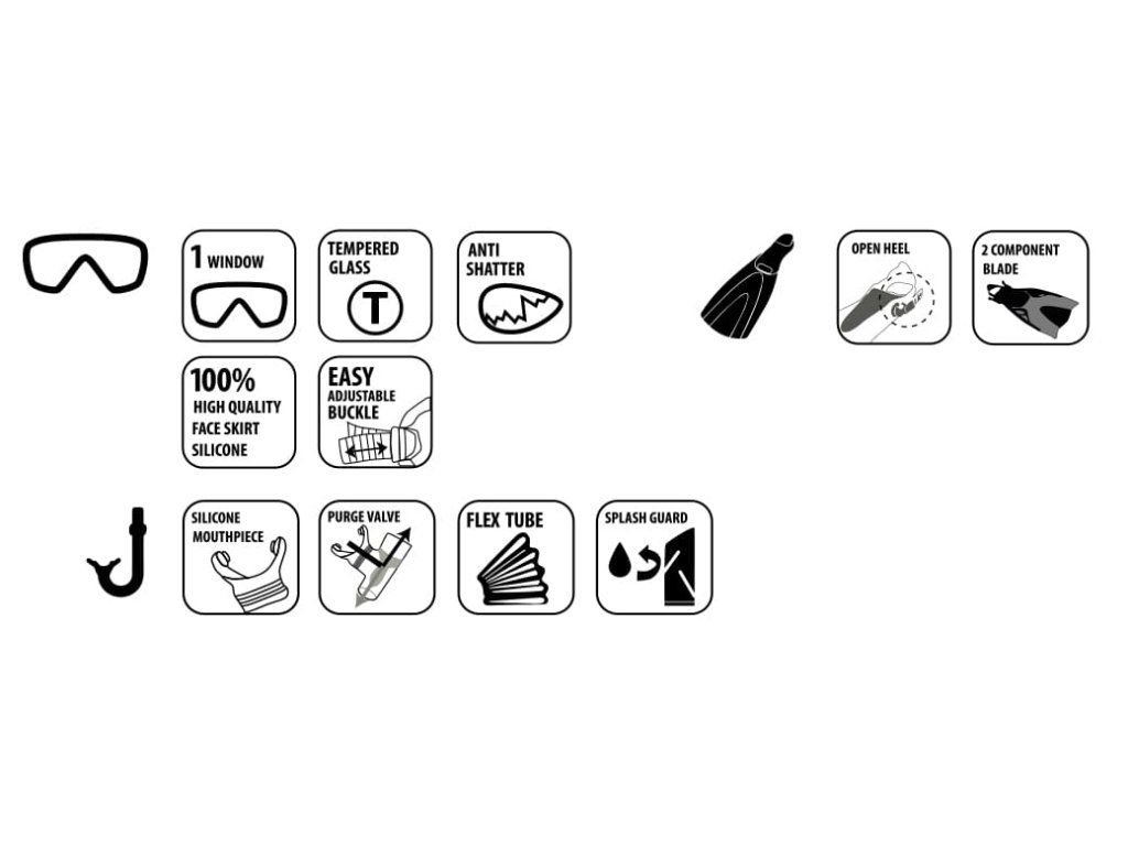 Potápačská súprava Cayman pre dospelých zahŕňa silikónové potápačské okuliare, šnorchel a nastaviteľné plutvy (L/XL 43 – 47). Balené v praktickom sieťovanom vrecúšku so sťahovacou šnúrkou. Súprava zaujme svojím vynikajúcim vybavením, vysokokvalitným silikónovým materiálom a moderným dizajnom. Šnorchel s pohyblivým úchytom Easy Clip sa prispôsobí prakticky akémukoľvek tvaru hlavy a rôznym veľkostiam. Na hornej časti má výrazný neónovo oranžový prvok proti vniknutiu vody. Okuliare sú vyrobené z celistvého ochranného skla pre lepšiu viditeľnosť. Nastavenie šírky pásu je veľmi ľahké vďaka dvom bočným sponám. Plutvy majú dvojkomponentnú konštrukciu, vďaka ktorej sú pri plávaní flexibilnejšie a pohodlnejšie. Sú otvorené vzadu a vybavené nastaviteľným popruhom. To znamená, že súpravu možno požičať aj priateľom s inou veľkosťou topánok. Celá súprava je uložená v praktickom uzatvárateľnom sieťovanom vrecúšku, takže budete mať všetko vždy po ruke. Mokrý obsah šnorchlovacej súpravy môže vďaka sieťke rýchlo vyschnúť a piesok sa ľahko vysype.Dodatočné parametre