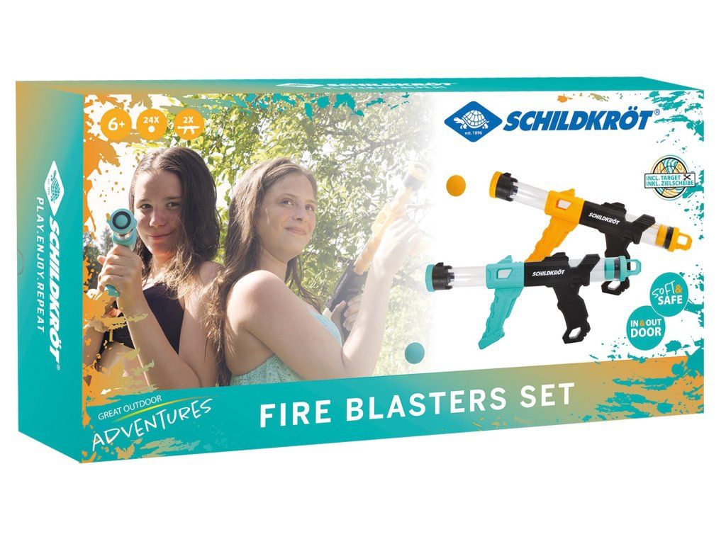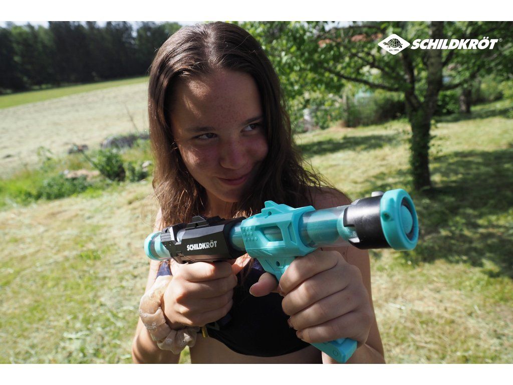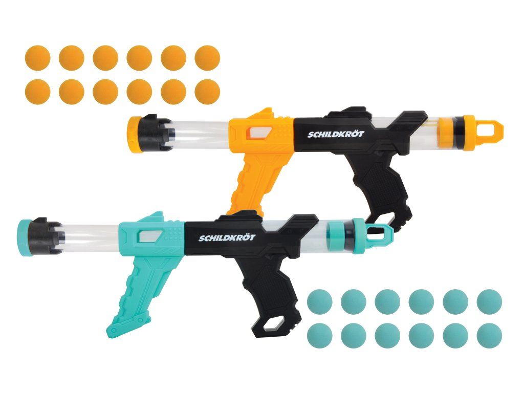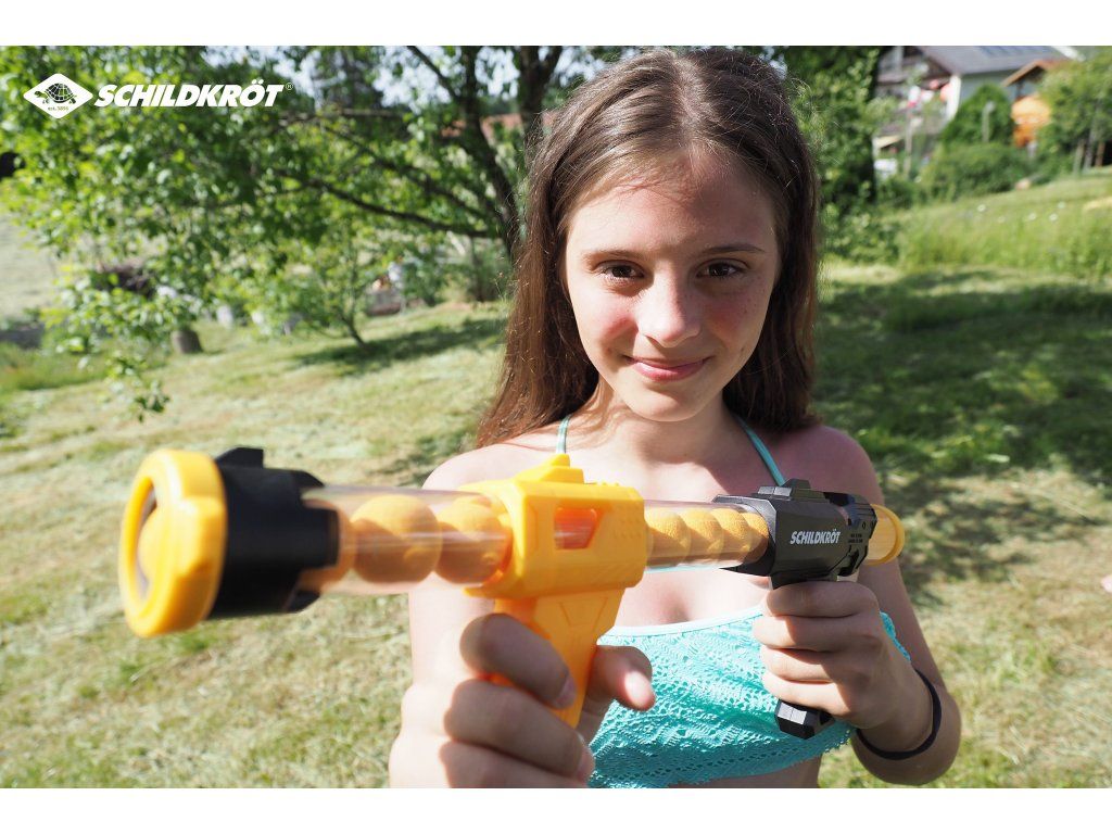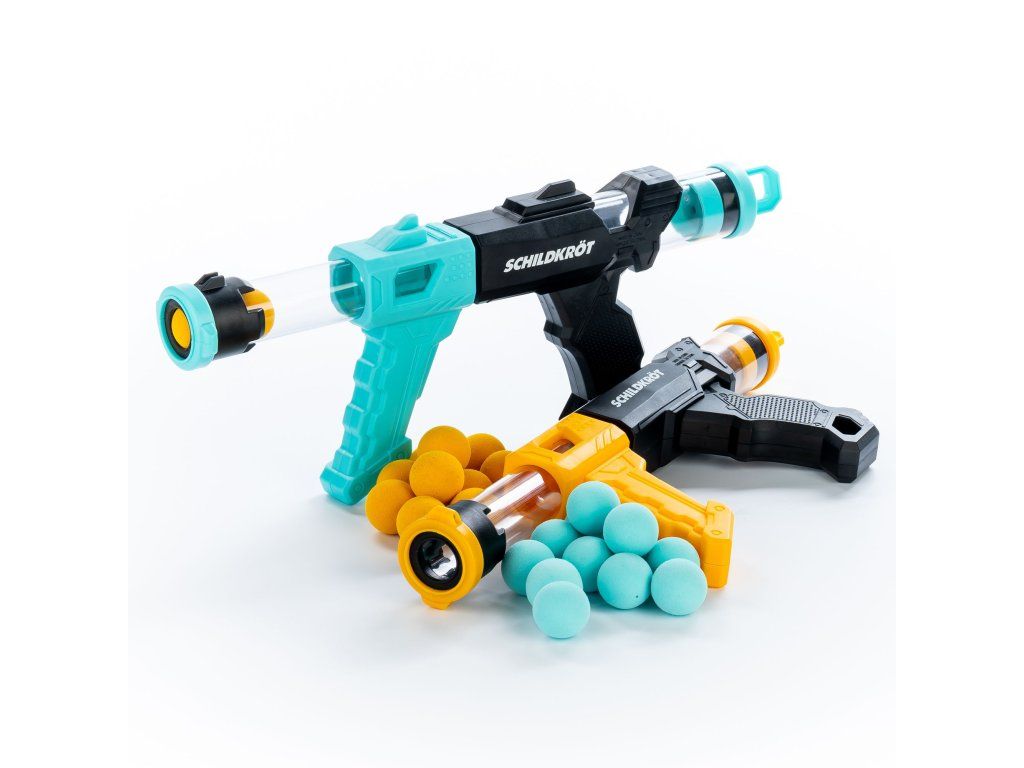 Súprava dvoch tlakových pištolí Schildkröt ponúka množstvo zábavy pre deti aj dospelých! Súprava obsahuje 2 pištole v rôznych farbách a zásobník, ktorý pojme až 12 guličiek. Tlakové pištole sa ľahko používajú. Stačí ich nabiť, pumpovať a vystreliť. Vďaka rýchlemu vystreľovaniu môžete zasiahnuť cieľ na dostrel až 6 metrov. Penové guličky (priemer 2,7 cm) sú mäkké a bezpečné pre hru ako v interiéri, tak vonku. Streľba je poháňaná tlakom vzduchu, ktorý vzniká stlačením oboch rukovätí k sebe. Rýchla streľba a precízne zameriavanie pomôžu zlepšiť koordináciu rúk a očí. Táto súprava je ideálna pre narodeninové oslavy, kempovanie alebo pikniky a zaručí hodiny zábavy pre celú rodinu. Balenie obsahuje: 2 tlakové pištole, 12 oranžových penových guličiek, 12 modrých penových guličiek. Náhradné penové guličky možno dokúpiť tu.Dodatočné parametre