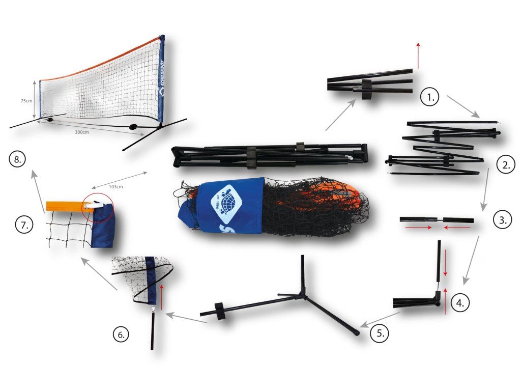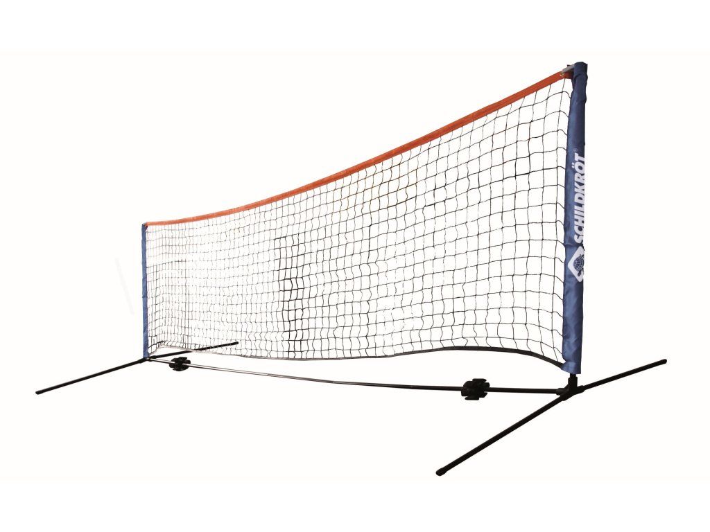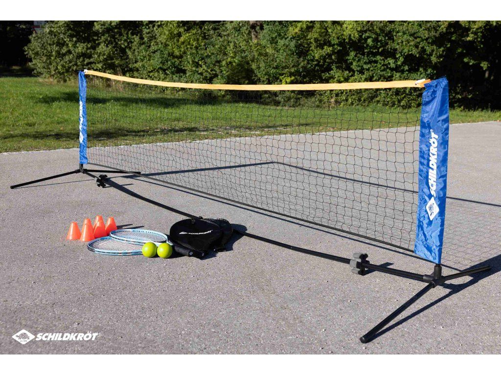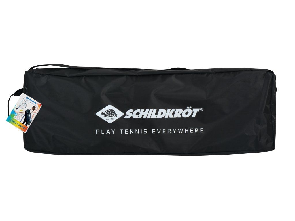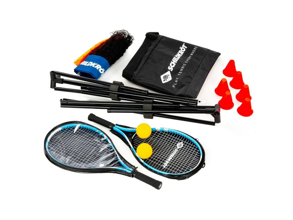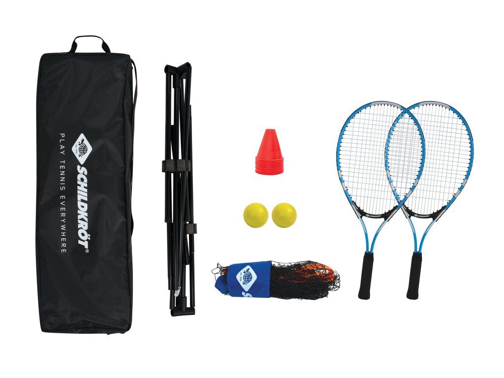 Vďaka tejto súprave na tenis od značky Schildkröt nič nestojí v ceste tenisovému zápasu. Tenisová súprava obsahuje všetko, čo potrebujete ku hre: 2 rakety s ochrannými obalmi, 2 loptičky (O 7 mm), samostatne stojacu sieť (výška 75 cm, dĺžka 300 cm) s oceľovými tyčami a 6 plastových kužeľov na vyznačenie hracieho poľa. S touto súpravou je zábava zaručená kdekoľvek. Nech už v interiéri, na chodbe alebo vonku na záhrade, príjazdovej ceste alebo ihrisku. Súprava obsahuje tiež návod a praktickú tašku cez rameno, do ktorej sa všetko pohodlne vojde.Dodatočné parametre
