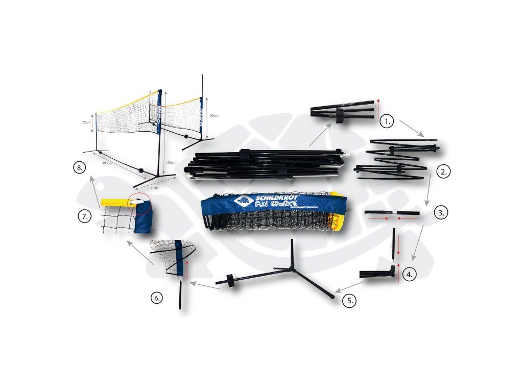 Všestranná sieť Kombi od Schildkröt je ideálna pre rôzne športy, ako je bedminton, tenis, nohejbal, detský volejbal alebo OGO šport. Hodí sa ako na záhradu, do parku, na pláž, tak aj do interiéru. Sieť je výškovo nastaviteľná (0,75 m až 1,55 m) a ľahko ju nastavíte pre rôzne športy vekovej kategórie. Konštrukcia je voľne stojaca, bez nutnosti ukotvovania. Montáž je jednoduchá a zvládne ju jedna osoba počas niekoľkých minút. Skladacie kovové rúrky majú vnútornú gumovú šnúru pre ľahkú montáž. Rám je vyrobený z čierne lakovanej oceľovej rúrky s priemerom 18 mm. Po použití sieť ľahko zbalíte do tašky (dĺžka 90 cm, priemer 15 cm) a vďaka ramennému popruhu je ľahké ju prenášať aj pre deti. Ideálne pre voľný čas a športové aktivity v každom prostredí. Rozmery balenia: 8 x 20 x 10 cm Hmotnosť: 2,55 kgDodatočné parametre