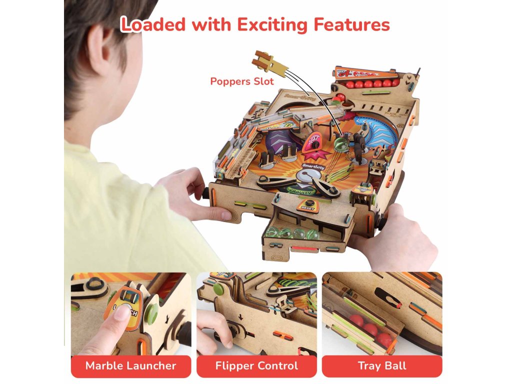 Táto konštrukčná súprava je zábavná vzdelávacia hračka pre malých majstrov od 8 rokov. Konštrukčná súprava má deťom pomôcť porozumieť základným princípom vedy a technológie. Hra s touto stavebnicou rozvíja kreativitu, motoriku, praktické zručnosti a vedomosti. Na zostavenie nepotrebujete ani lepidlo ani náradie. Jednotlivé dieliky sú vyrezané s veľkou presnosťou pomocou laseru. Všetko tak pri zostavení do seba jednoducho zapadá. Stavebnica je vyrobená z ekologického udržateľného dreva. Súprava obsahuje zrozumiteľný návod s obrázkami. Návod pomôže deťom bez problémov porozumieť každému kroku pri zostavení pinballu.
