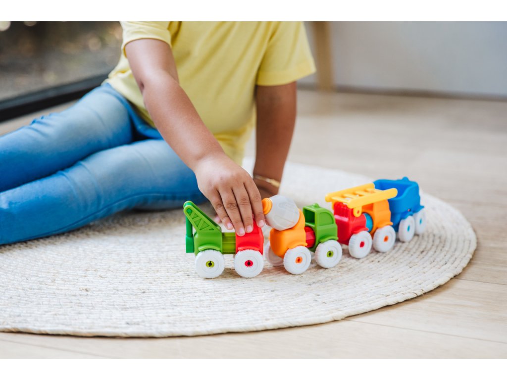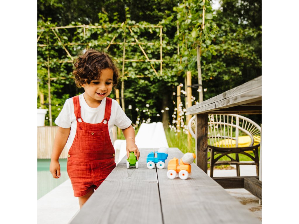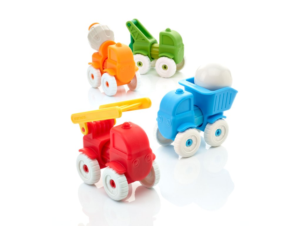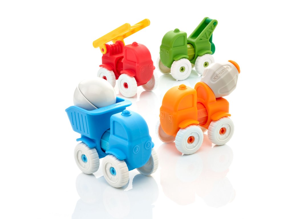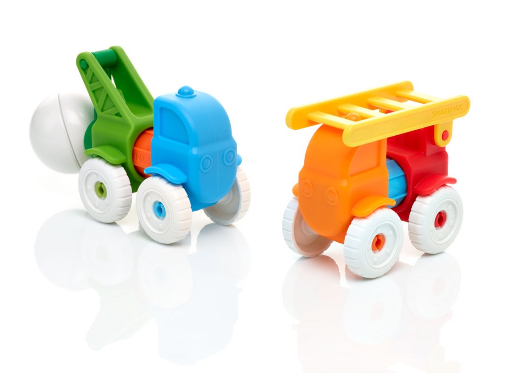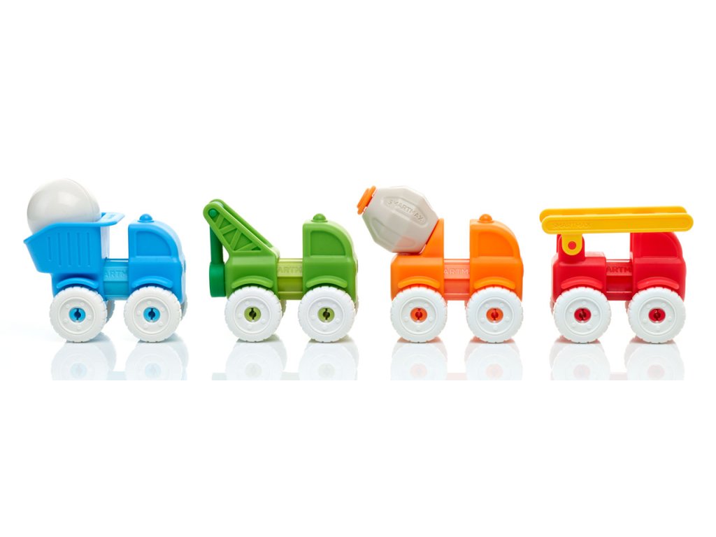 Súprava 4 magnetických tyčiek a nasadzovacích predných a zadných častí autíčok v štyroch rôznych farbách. Deti si tak ľahko zostavia 4 rôzne autíčka: hasičské auto, nákladiak, miešačku a nakladač. Na hranie majú tiež k dispozícii jednu magnetickú guľu, ktorá poslúži nielen ako náklad do nákladiaku, ale tiež umožňuje súpravu použiť ako prvú malú stavebnicu. Dieliky sú dostatočne veľké, príjemné a ľahké na manipuláciu. Ideálna jednoduchá stavebnica pre malé deti od 1 roka, ktorá využíva na spájanie jednotlivých častí magnetizmus. Balenie obsahuje celkom 13 dielikov: 4 magnetické tyčky, 4 predné a 4 zadné diely autíčok a 1 magnetickú guľu, ktorá poslúži nielen ako náklad do nákladiaku, ale umožňuje súpravu použiť ako prvú malú stavebnicu.