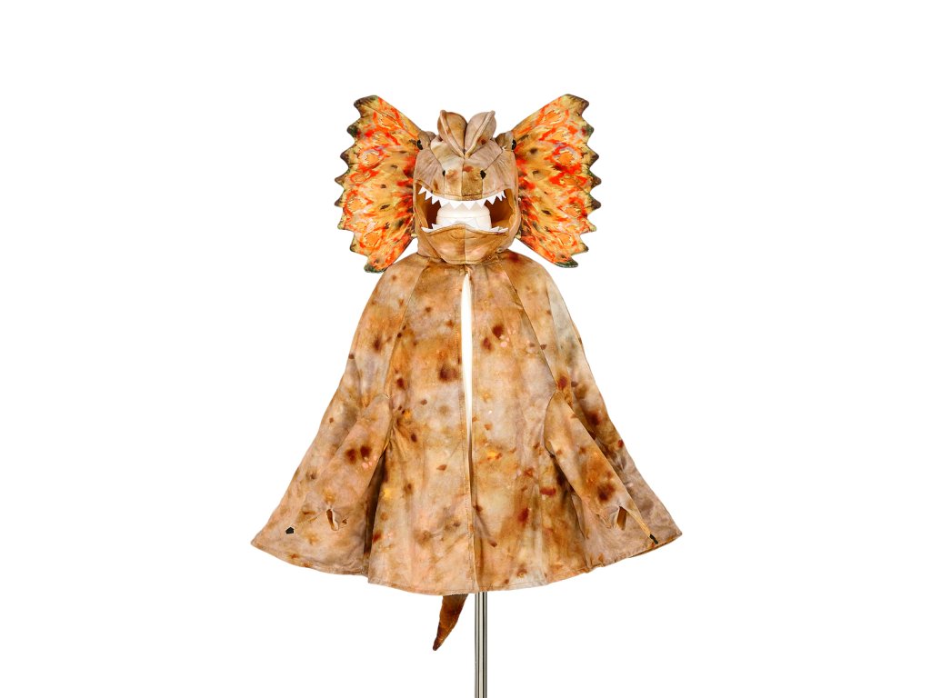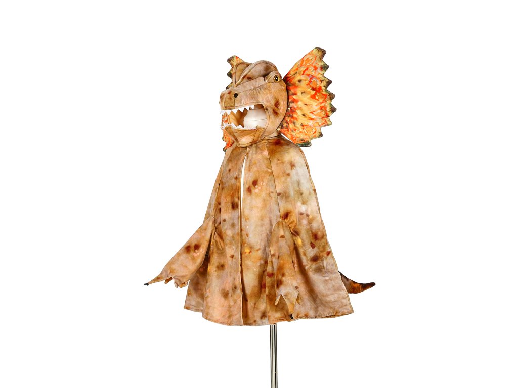 Pôsobivý kostým Dilophosaura v oranžových a hnedých odtieňoch imitujúcich dinosauriu kožu. Pláštenka je vyrobená z mäkkého zamatu, má chvost, dlhšie rukávy s tlapkami. Kapucňa je zároveň aj pôsobivá 3D maska. Kostým sa zapína na suchý zips pri krku. Pre ľahšie použitie je odnímateľná spodná čeľusť. Tento krásny kostým je mäkký na dotyk a pohodlný na nosenie. Skvelý kostým na karneval, oslavy, detskú párty alebo len tak na hranie, pretože každý deň sa môže zmeniť na dinosaurie dobrodružstvo!
