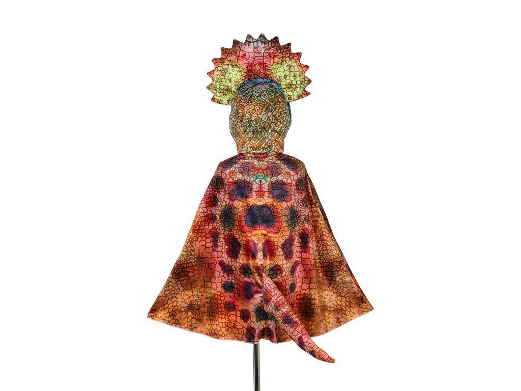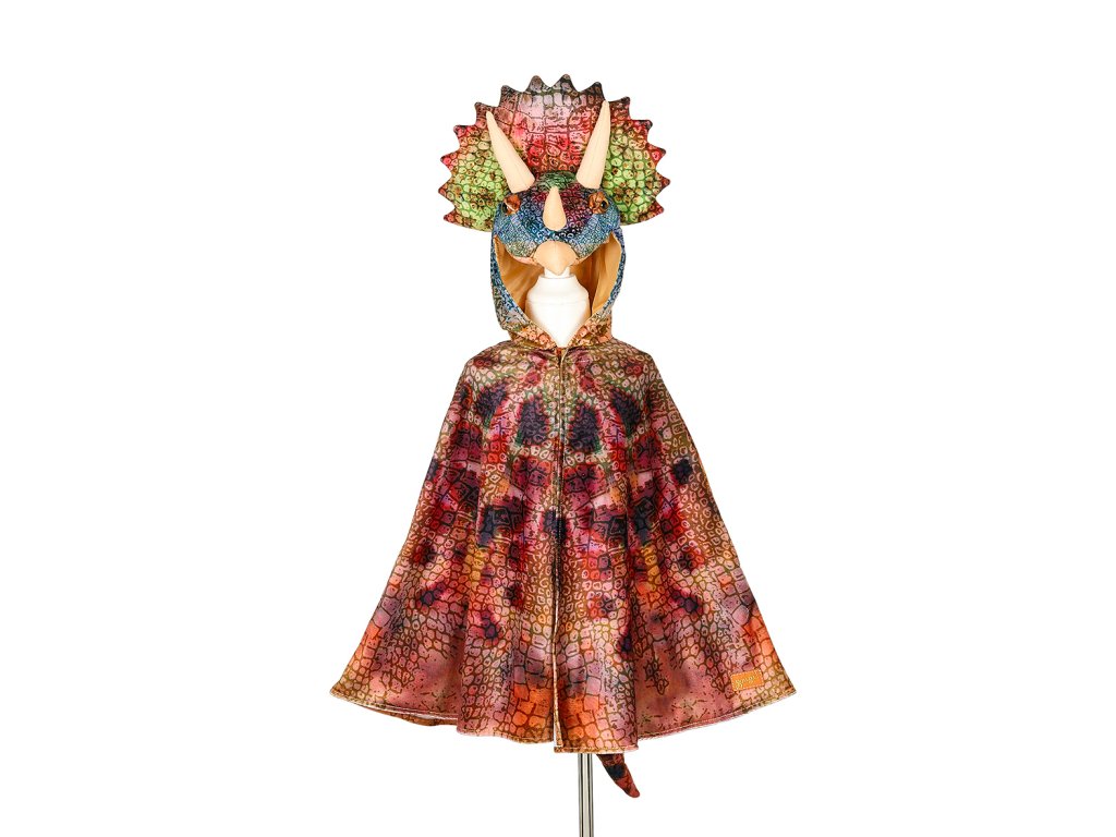 Skvelo spracovaný kostým Triceratoptosa s dôrazom na detail. Kostým má potlačenú textúru imitujúcu dinosauriu kožu. Plášť je vyrobený z mäkkého zamatu, má chvost, kapucňa je zároveň aj pôsobivá 3D maska. Tento krásny kostým je mäkký na dotyk a pohodlný na nosenie. Perfektný kostým na karneval, oslavy, detskú párty alebo len tak na hranie, pretože každý deň sa môže zmeniť na dinosaurie dobrodružstvo!