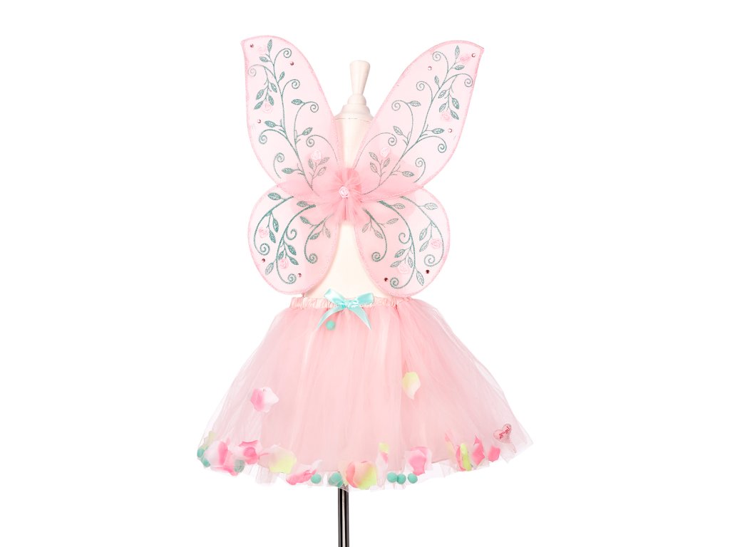 Krásny, precízne vyrobený kostým pre dievčatá. Sukňa má klasický rozšírený strih a elastický pás. Skladá sa z ružovej podšívky a dvoch vrstiev tylu, ktorého okraj je ozdobený mini brmbolcami a dúhovým kvetmi. Sukňa je v páse nastaviteľná vďaka gumičke s gombíkovými dierkami. Súčasťou kostýmu sú aj vyšívané elfie krídla zdobené tylovou kvetinou. Krídla sa nosia pohodlne vďaka elastickým ramienkam a možno ich využiť aj samostatne. Tento kostým je ideálny na karneval, na každodenné hranie, tematické oslavy, fotenie, alebo ako výnimočný darček pre malú vílu.