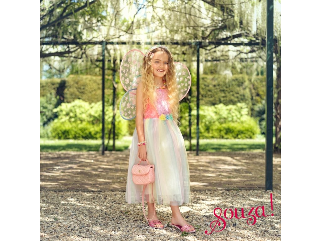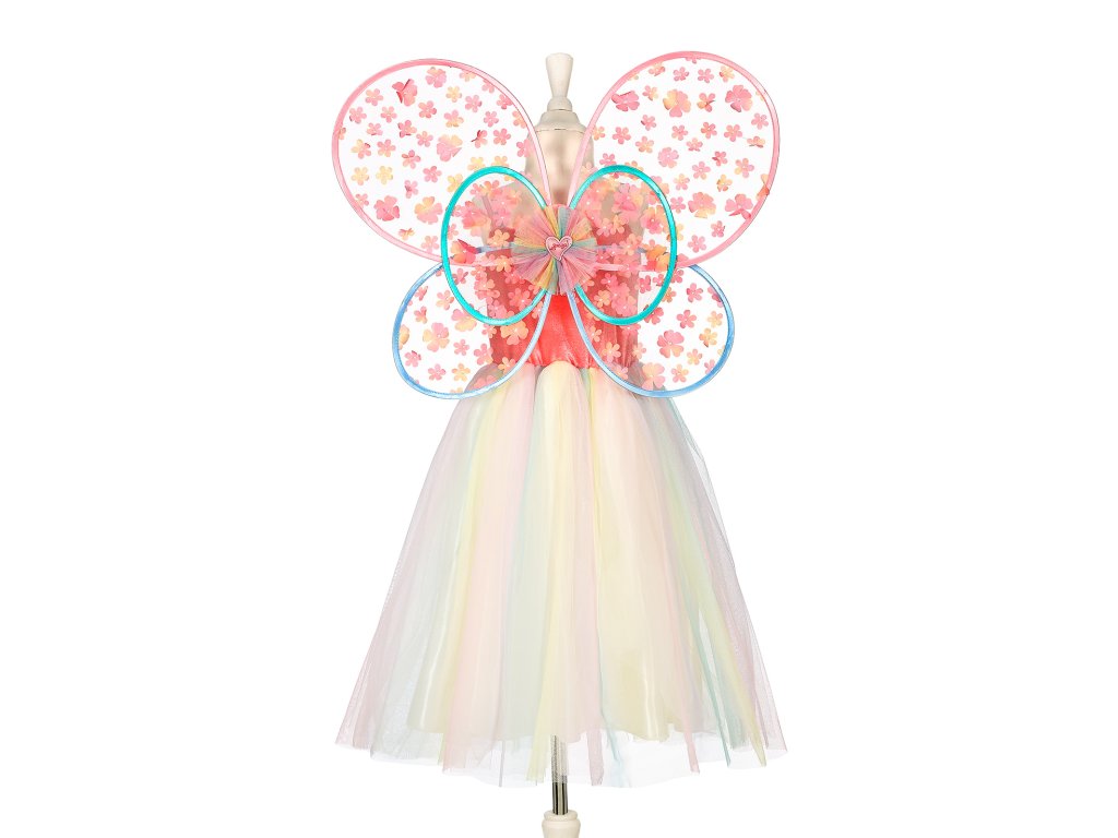 Krásne dievčenské šaty s motýlími krídlami. Majú klasický strih, živôtik s dvojitými ramienkami a v páse sú ozdobné kvetiny. Dúhový tyl dodáva kostýmu ľahkosť a eleganciu. Priesvitné, viacvrstvové krídla v odtieňoch ružovej dotvárajú celkový vzhľad. Tento kostým je ideálny na karneval, tematické oslavy, fotenie, každodenné hranie alebo ako výnimočný darček pre malú vílu.