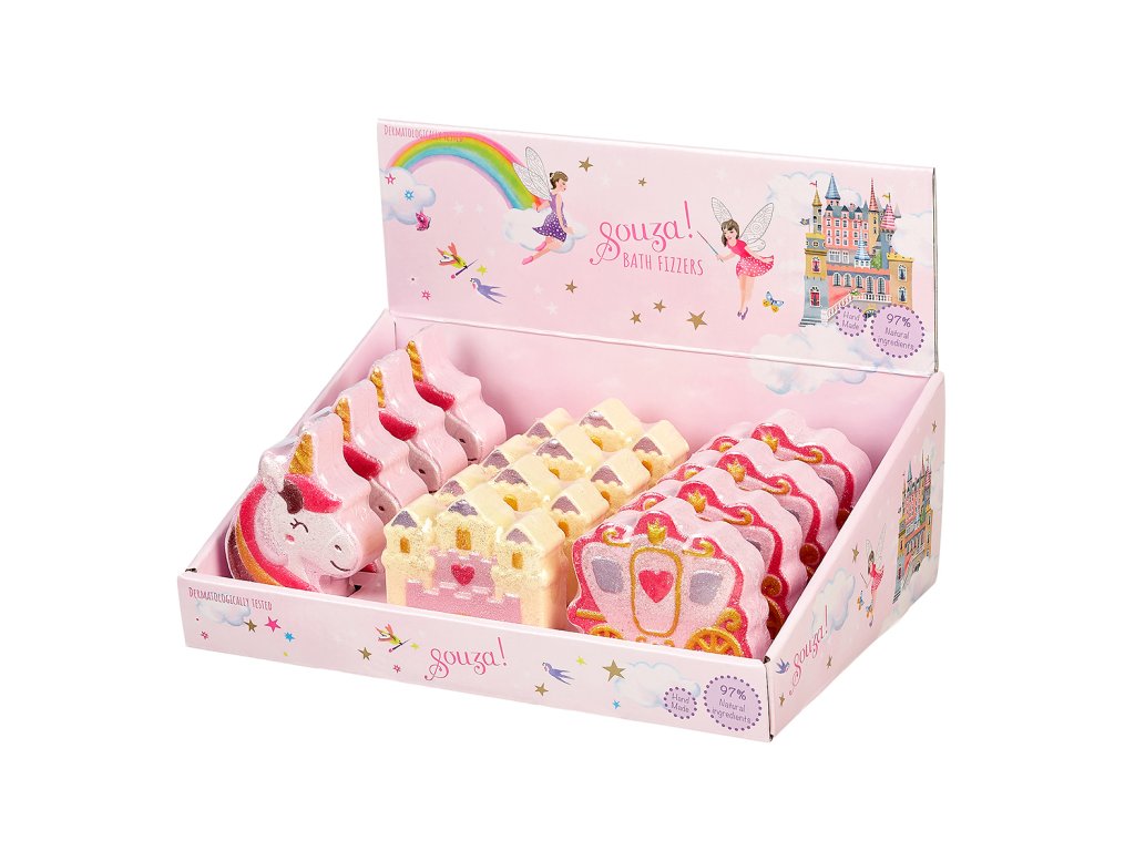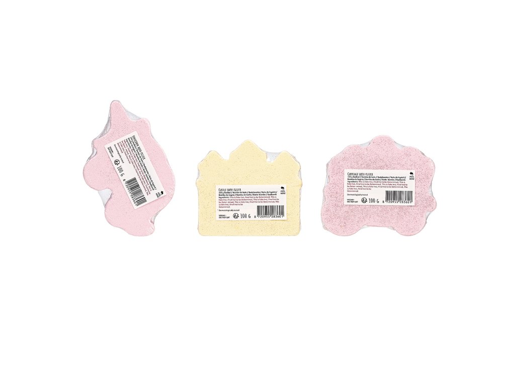 Kúzelné bomby do kúpeľa pre malé princezné. Tri rôzne druhy – jednorožec, kočiar a zámok.