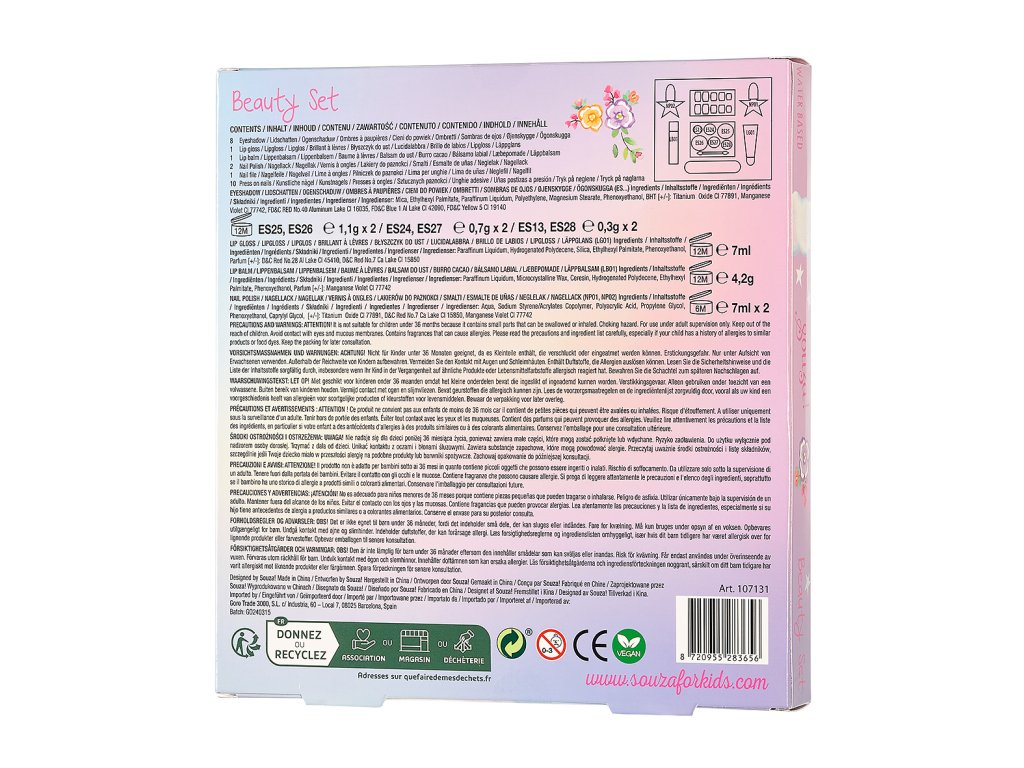 Obsah súpravy: 2 laky na nechty (2× 7 ml), balzam na pery (4,2 g), lesk na pery (7 ml), 6 trblietavých očných tieňov, 10 samolepiacich dekoratívnych umelých nechtov, pilník na nechty, dvojitý aplikátor.