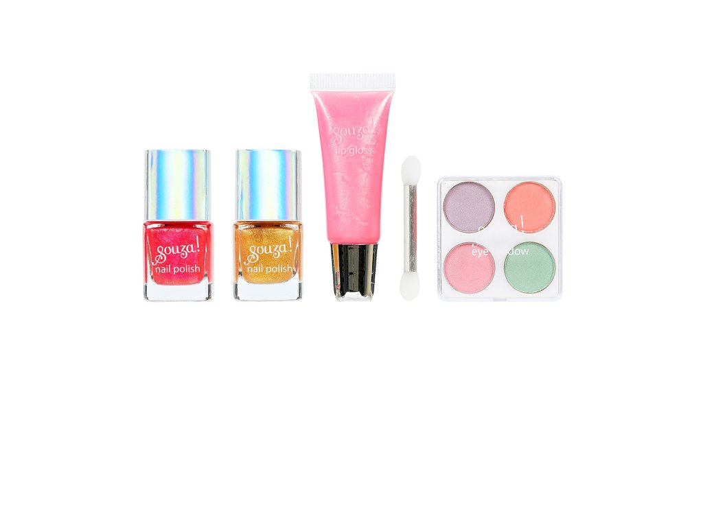 Detská mejkap súprava pre malé parádnice od 6 rokov obsahuje paletu so 4 očnými tieňmi, ružový lesk na pery, 2 laky na nechty a aplikátor s dvomi hubkami. Lesk na pery a očné tiene sa ľahko zmývajú teplou vodou a mydlom. Laky na nechty vytvárajú zlupovaciu vrstvu, vďaka čomu sa ľahko odstraňujú (ako samolepky). Produkt je 100 % vegánsky a netestovaný na zvieratách.Dodatočné parametre