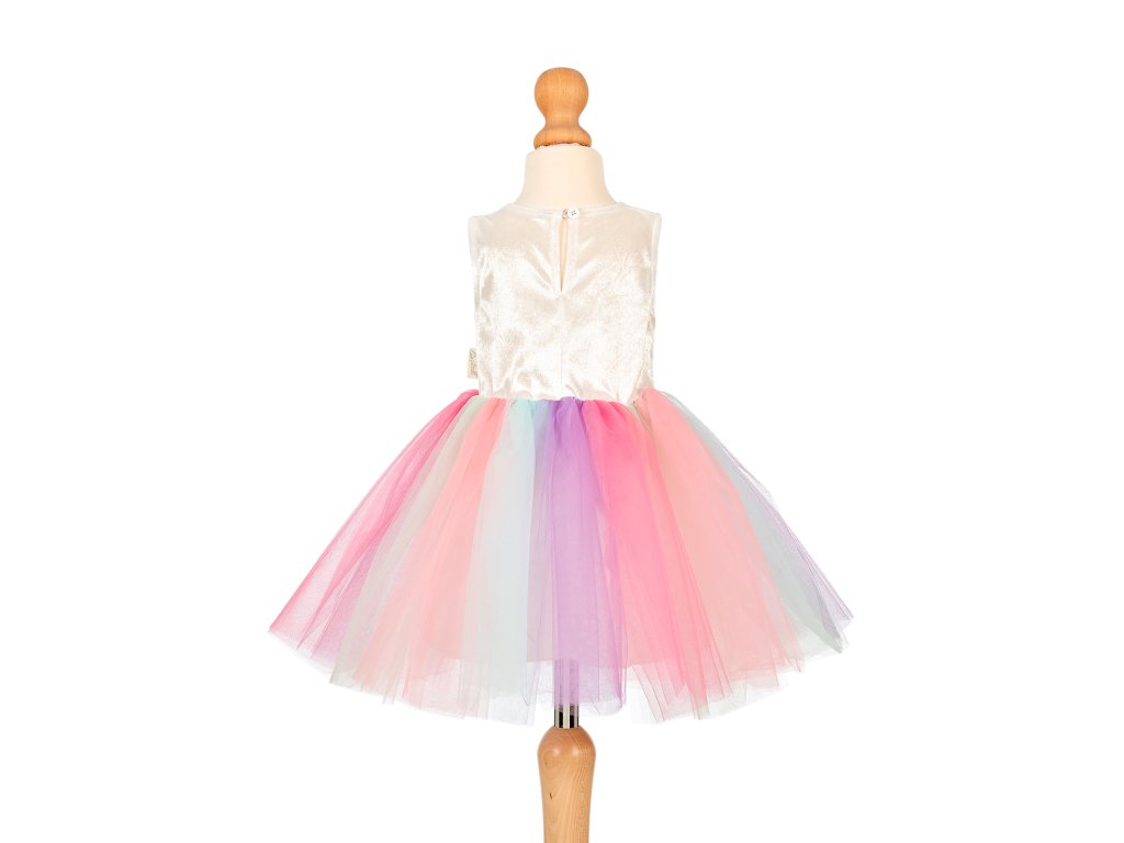 Čarovné šaty s motívom jednorožca sú navrhnuté špeciálne pre dvojročné deti, majú veľkosť 92 cm a sú ideálne pre prvé prezliekacie dobrodružstvo. Vrchnú časť šiat zdobí výšivka jednorožca s trblietavým rohom a farebnými kvetmi. Sukienka je z vrstveného tylu v pastelových farbách dúhy, ružovej, fialovej aj tyrkysovej. Šaty sú nielen očarujúce, ale aj veľmi pohodlné na nosenie. Perfektná voľba na karneval, narodeninovú oslavu, fotenie alebo len tak na každodenné hranie doma. Popustite uzdu svojej fantázii a prežite nezabudnuteľné dobrodružstvá v krajine jednorožcov!